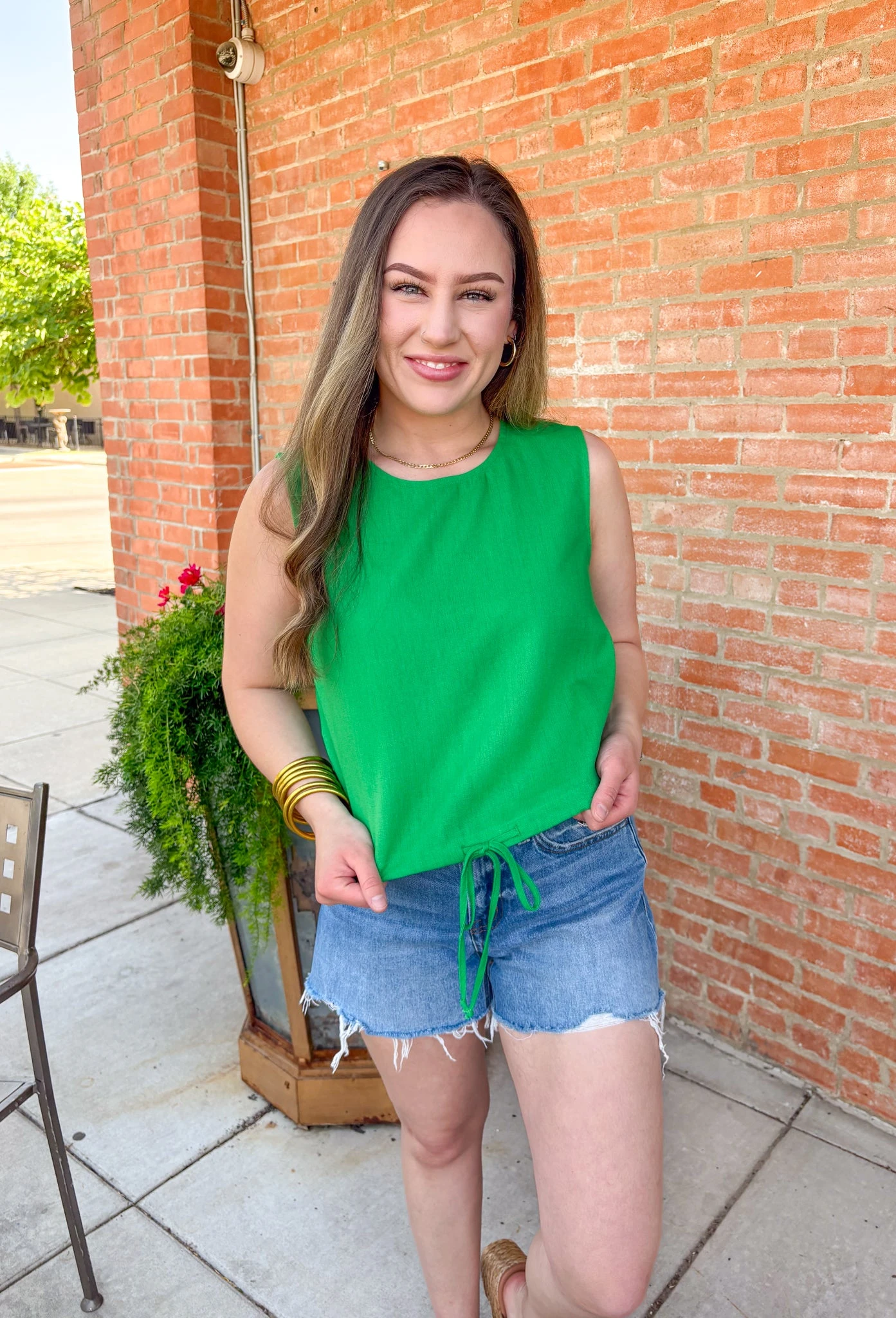 Elevate your everyday style with this green linen top from Wishlist. Designed with a timeless sleeveless cut and a flattering self-tie detail at the waist, this top is the perfect blend of comfort and sophistication. The breathable linen-cotton blend makes it a must-have for warm weather days, while its versatile silhouette ensures it pairs effortlessly with everything from tailored trousers to casual denim. Add a statement necklace and strappy sandals for an chic look that transitions seamlessly from day to night. Don’t miss out on this essential wardrobe staple!