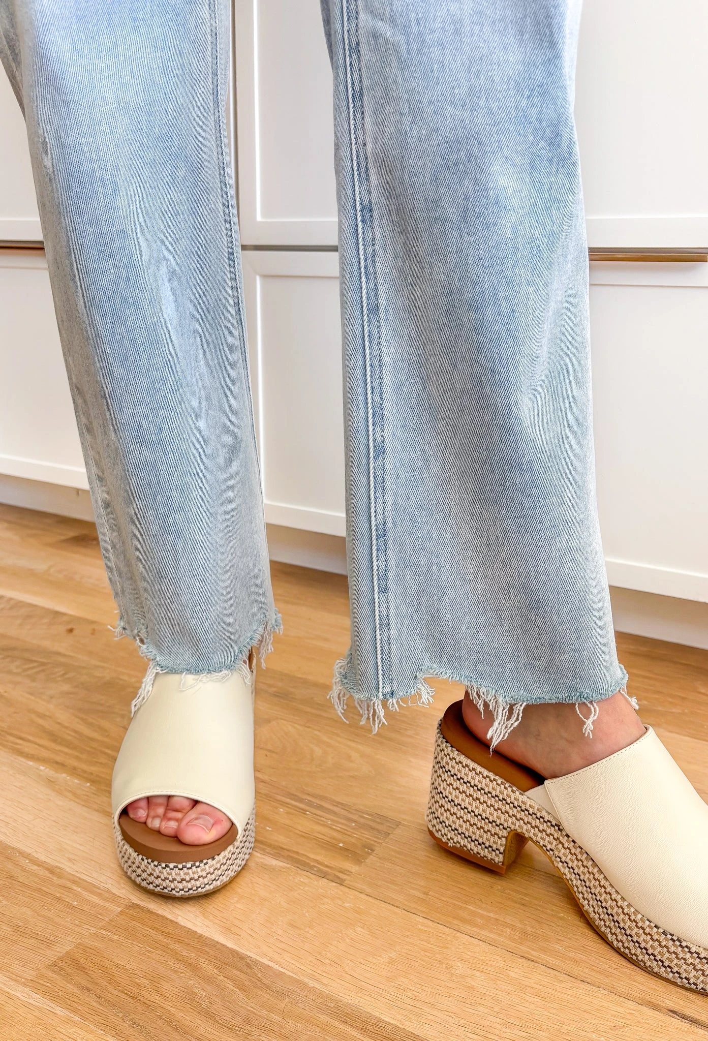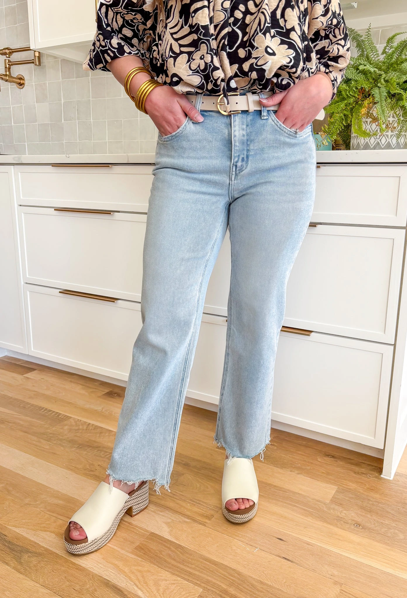 These light wash high rise jeans offer a slim wide cut, creating a flattering silhouette that is both trendy and comfortable. Perfect for any occasion, these jeans are a must-have!