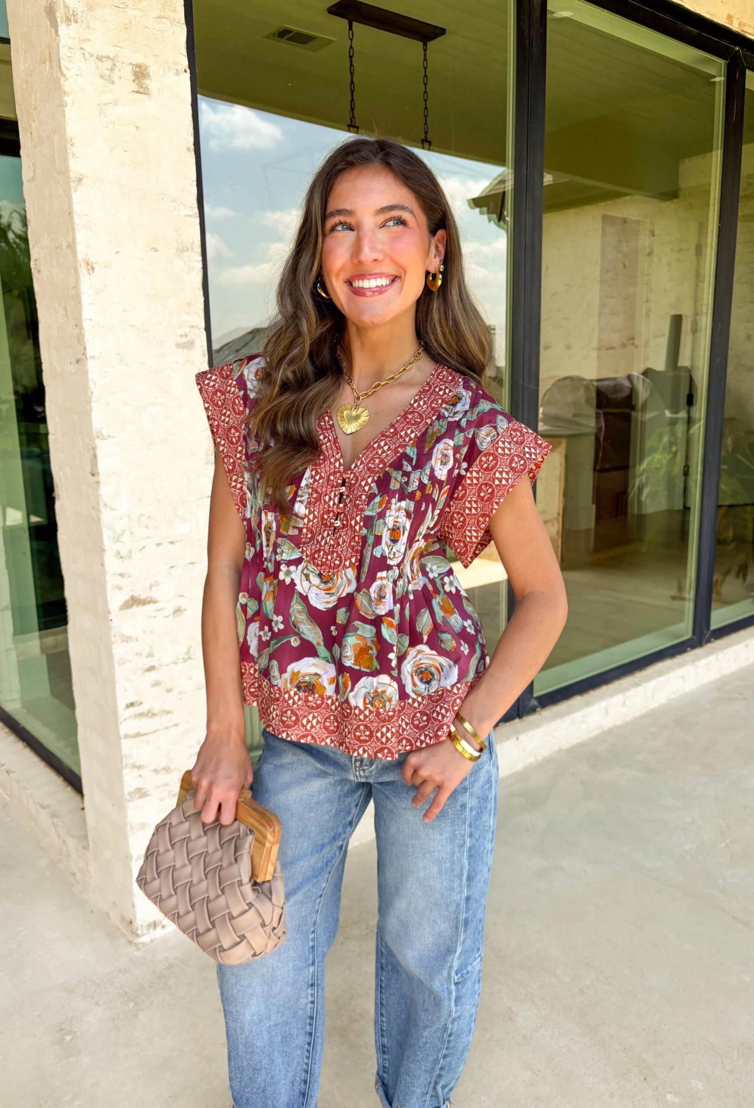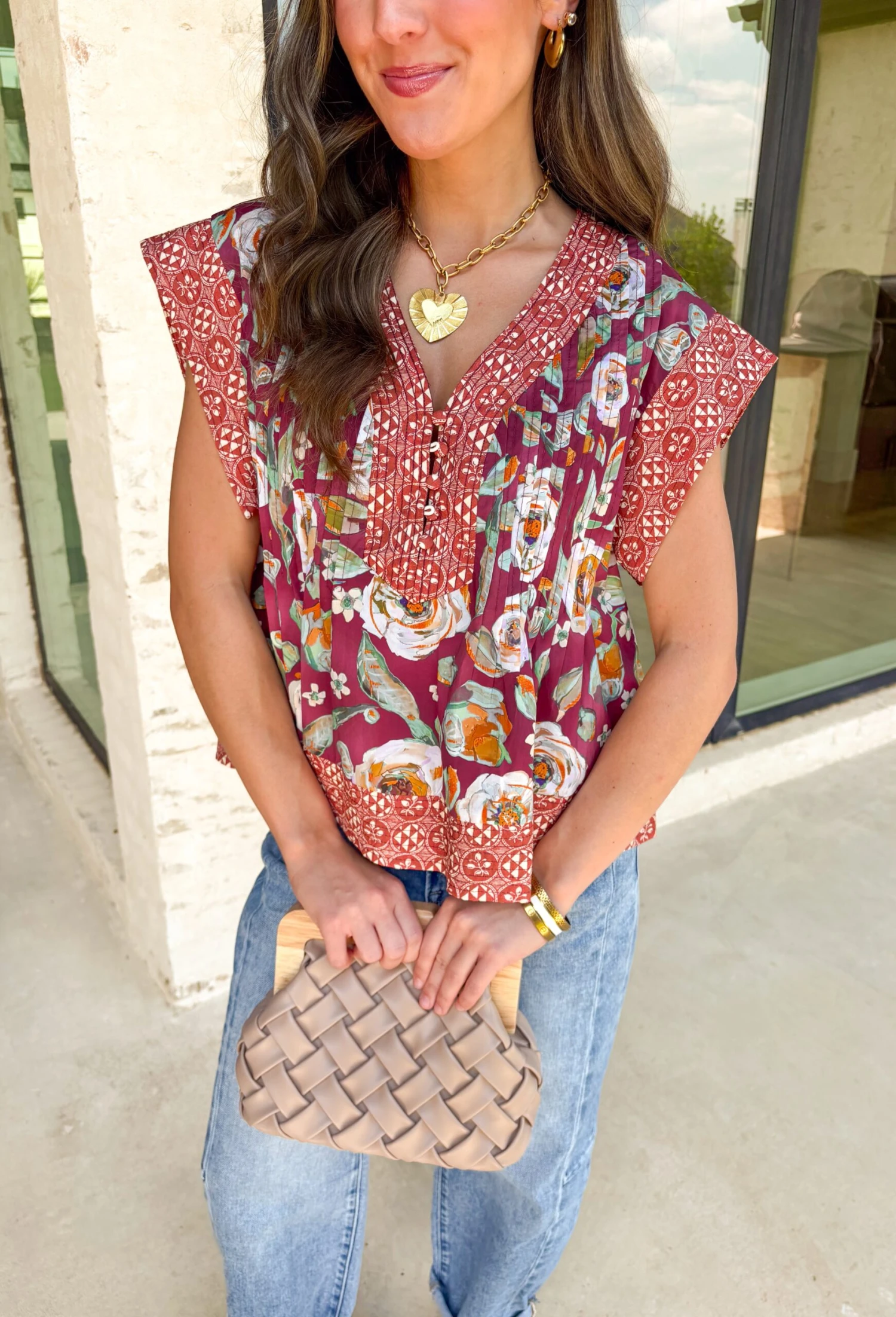 Say hello to fall in the most festive way with this multi-print pintuck top! Designed with exposed stitching, contrasting patterns, and warm autumn tones, it’s got that effortless charm that pairs perfectly with your favorite denim or trousers. The slit sleeve band and structured pin-tuck detailing give it just the right amount of flair for pumpkin patches or coffee dates alike.
