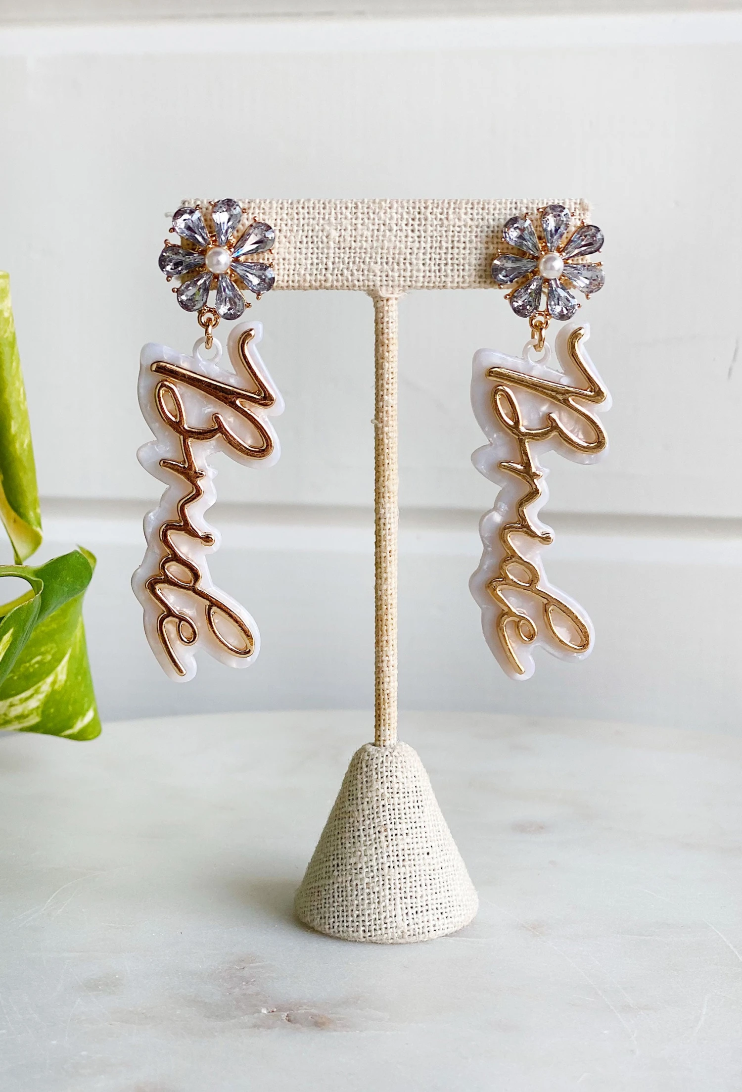Make a statement on your special day with the Bride Statement Earrings! A perfect addition to any bridal look, these dazzling accessories will surely make you sparkle with joy. These neutral acrylic earrings feature an elegant gold cursive that says ‘bride’ – perfect for celebrating and honoring your special moment. You’ll also love the beautiful rhinestone floral post and dainty pearl detail, adding a touch of luxury to your look.