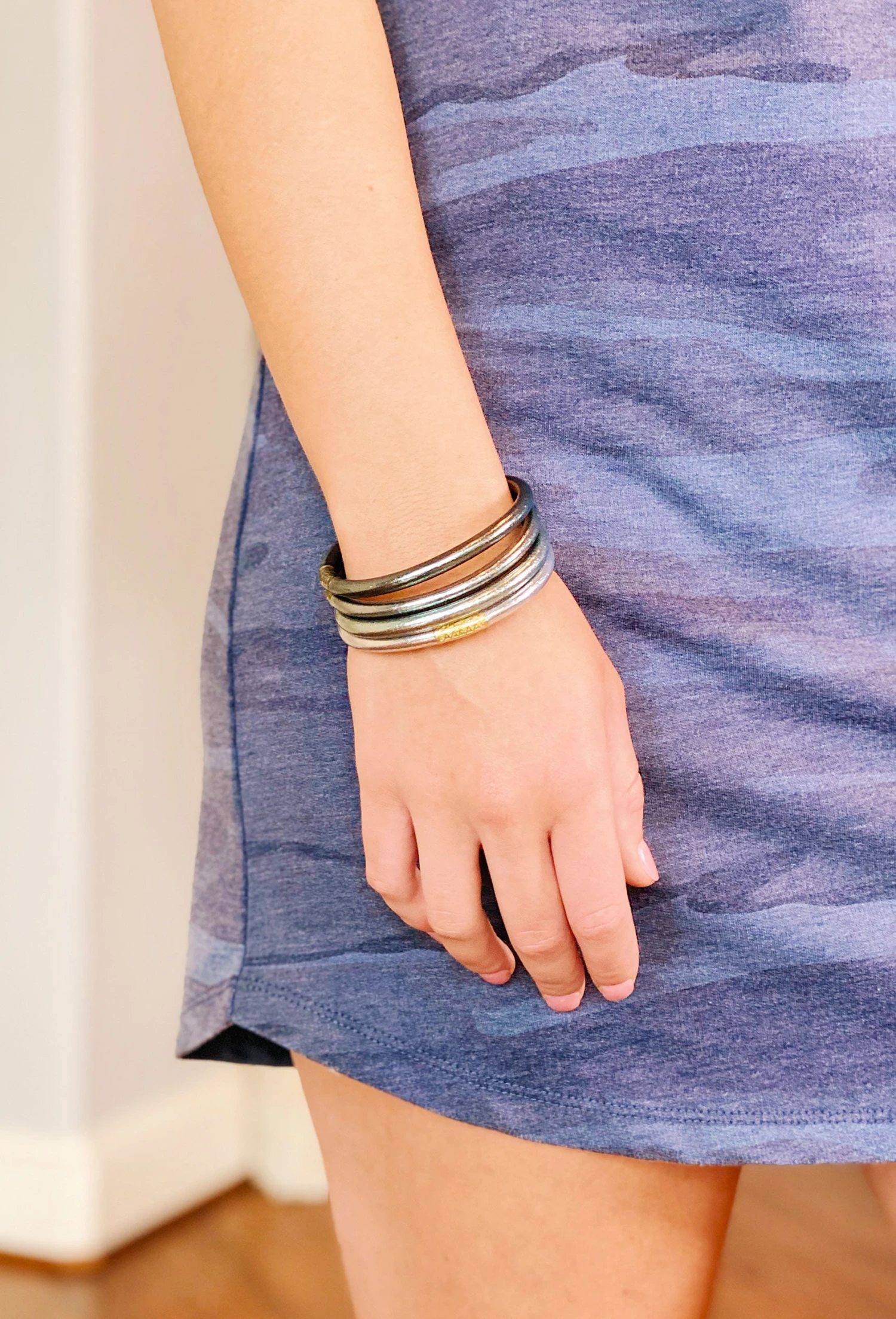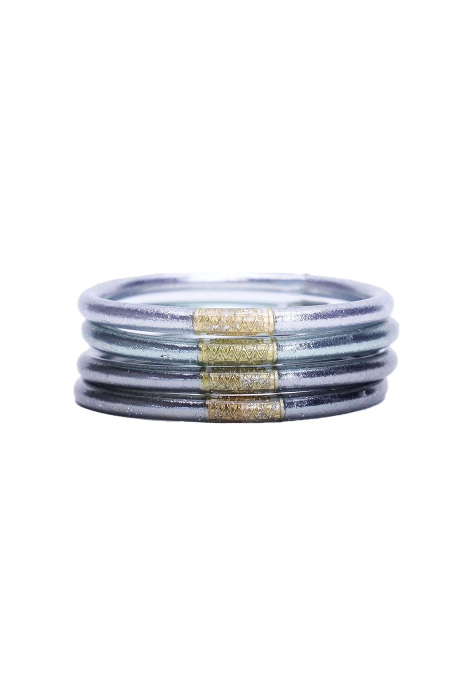 All Weather Bangles® (AWB®) are at the heart of BuDhaGirl. These divine Moon-colored set of four AWB have the amazing qualities that make them a must-have for the modern goddess…they are weightless, soundless, waterproof, and TSA proof. Each of the four Moon AWB in the set is meant to represent the gradating coloration of life. We call it the “ombre” of things; situations or events in life that are at first heavily tinged with emotion, and then with time, transition to becoming a peaceful part of life. Moon AWB are made of flexible, custom-colored polyvinyl carbonate rings that are then filled with gold and silver leaf and sealed with our exclusive BuDhaGirl Serenity Prayer bead. This unique non-metal material allows you to go from the pool, to the office, and through the airport all without needing to take them off.