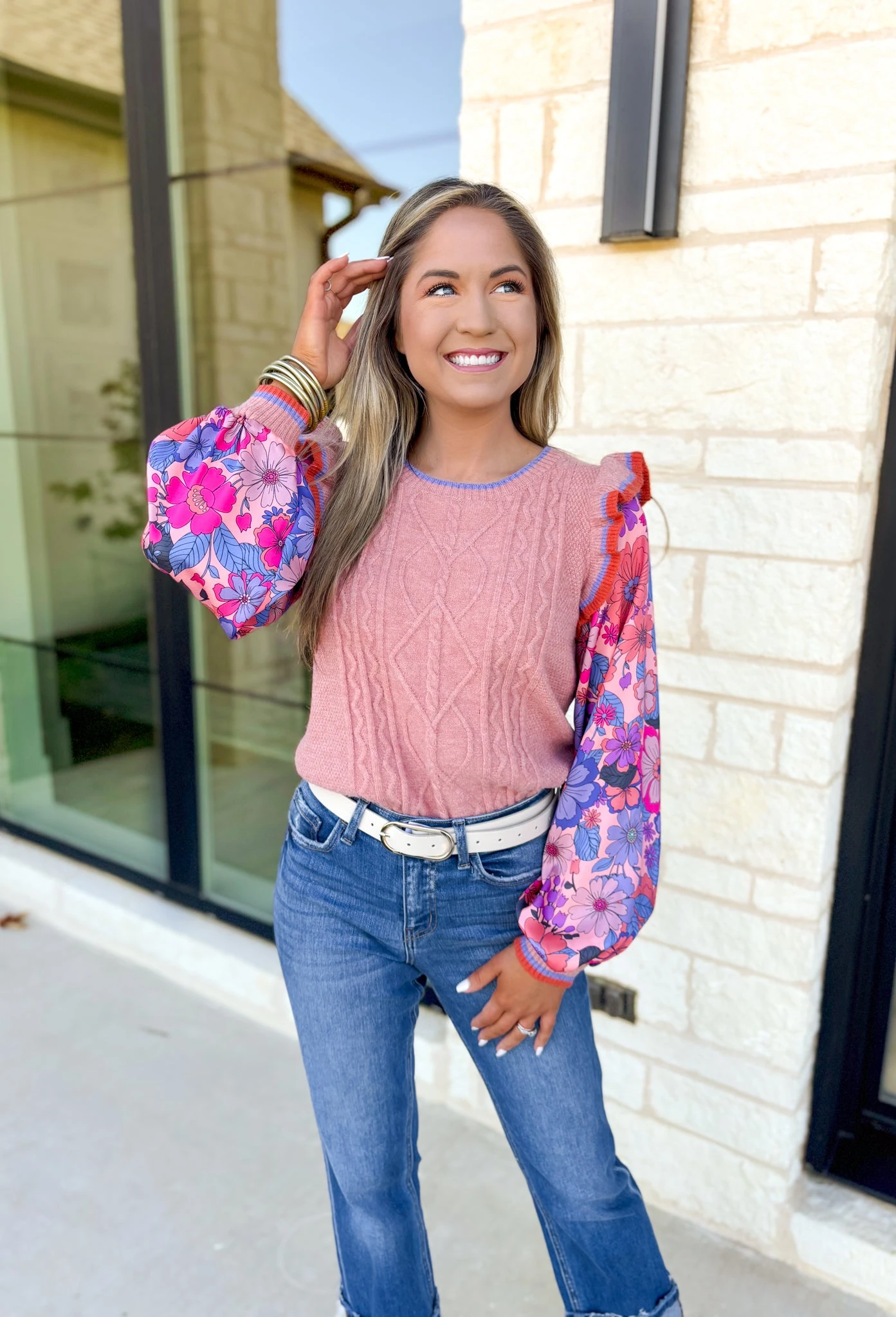 Revamp your wardrobe with our By The Book Top! This apricot cable knit sweater boasts ruffle sleeves, while the colorful floral print sleeves add a pop of color. Stay cozy and stylish all day long.
