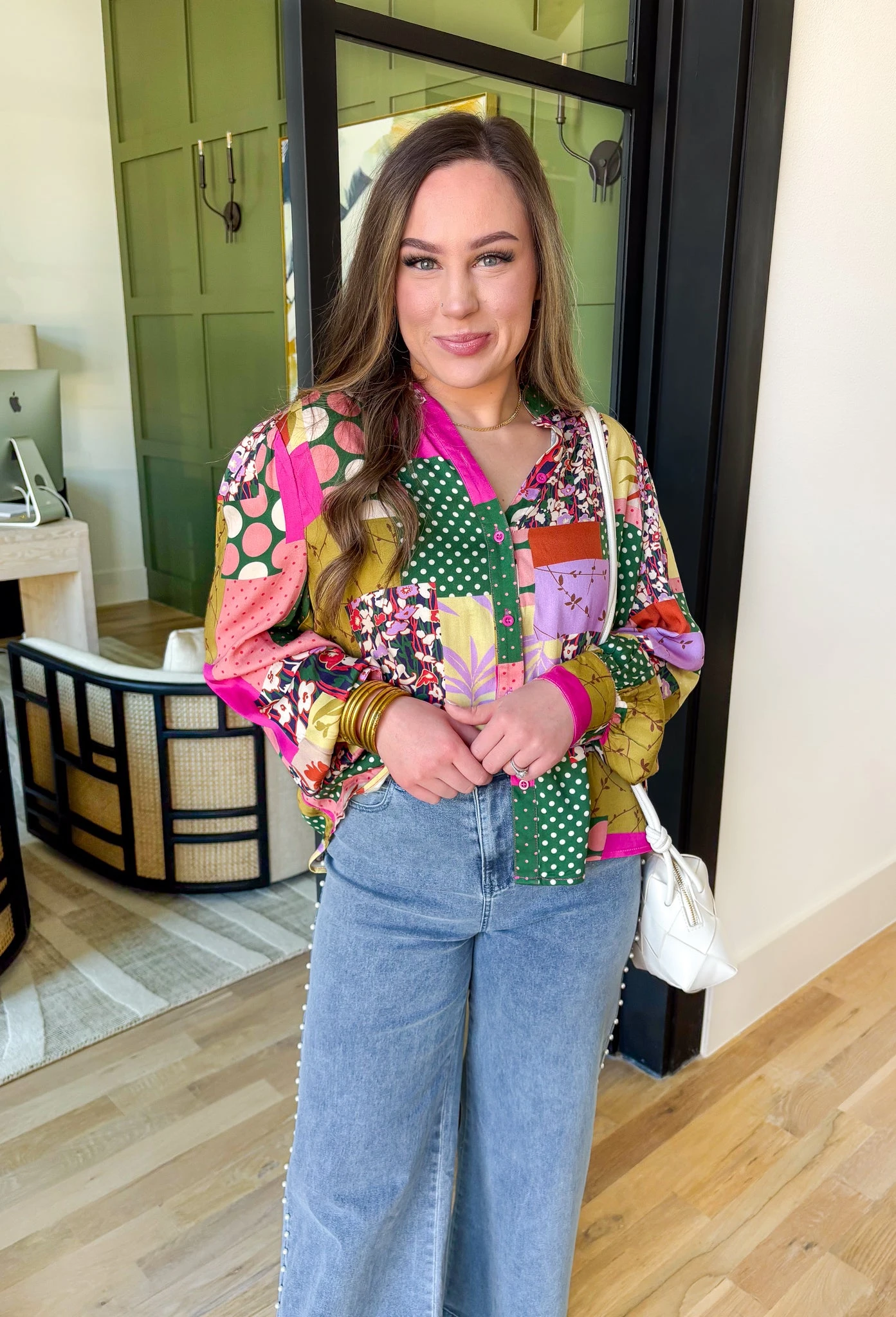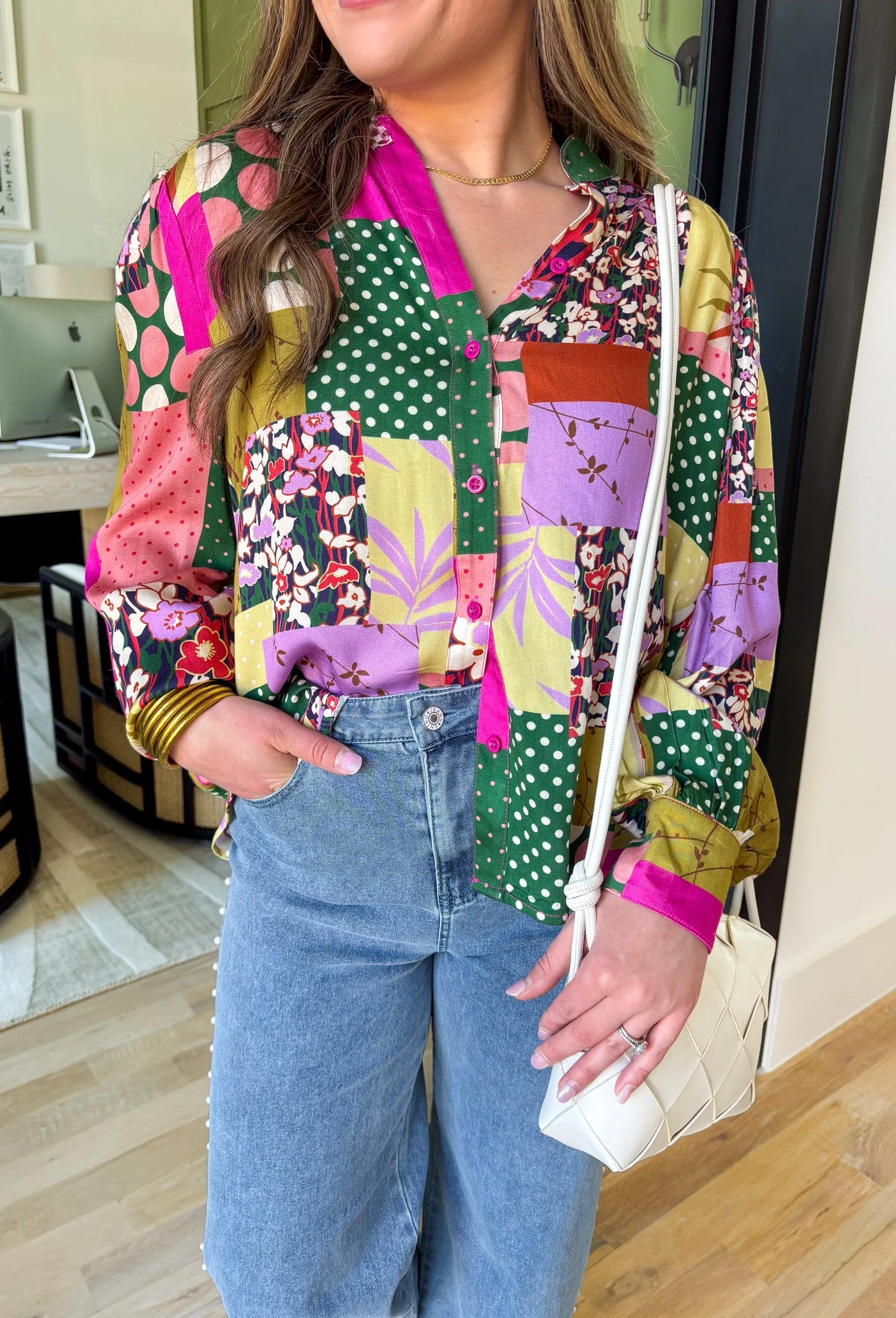 Add a burst of color to your wardrobe with this long sleeve button-up top, featuring a playful patchwork print and delicate floral detailing. Made by Fate with 100% lightweight rayon, this top offers a breezy feel and a relaxed fit that’s perfect for layering or wearing on its own. Whether you’re heading to brunch, the office, or a casual weekend outing, this top is as versatile as it is eye-catching. Pair it with your favorite denim or tailored pants for a look that’s uniquely you!