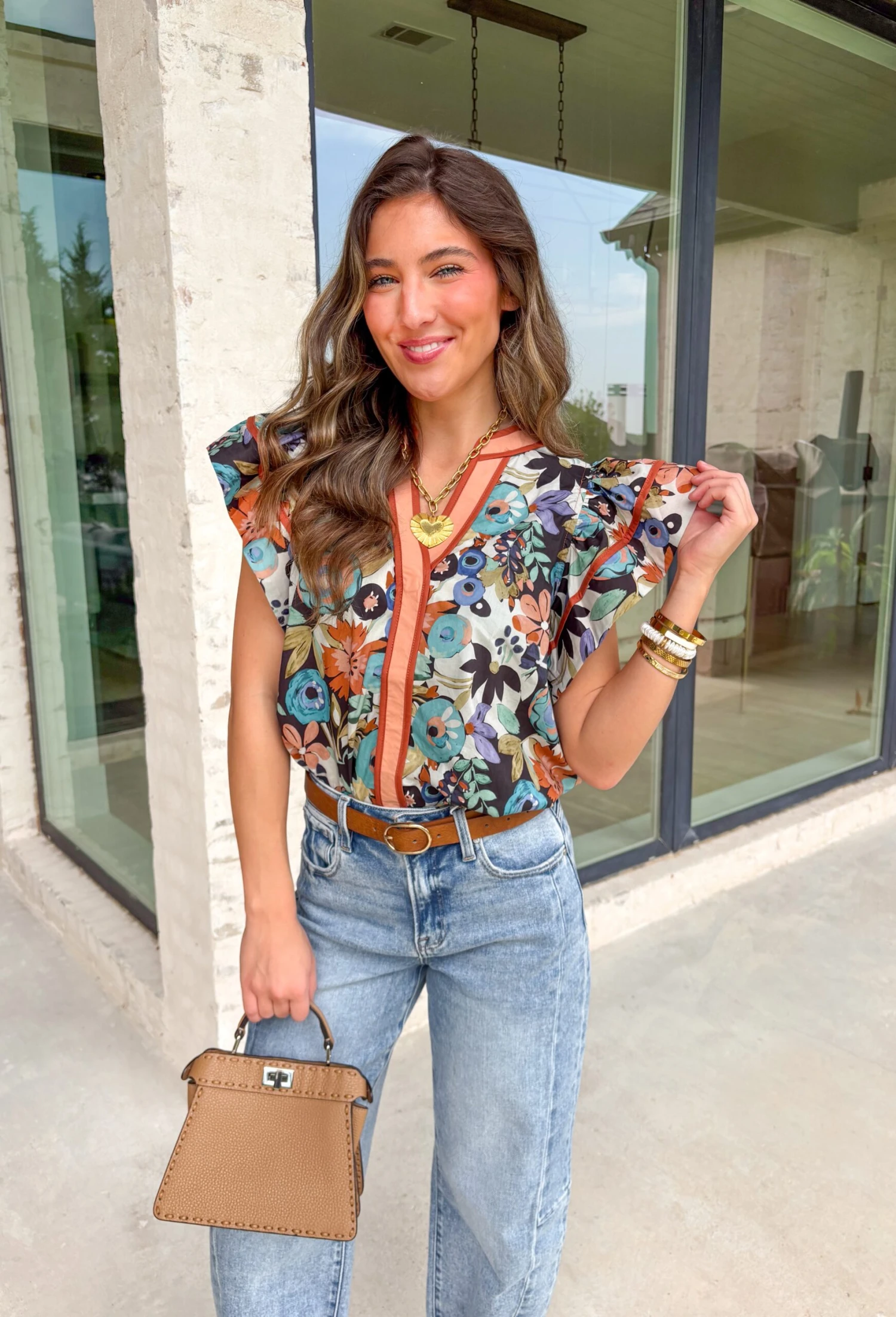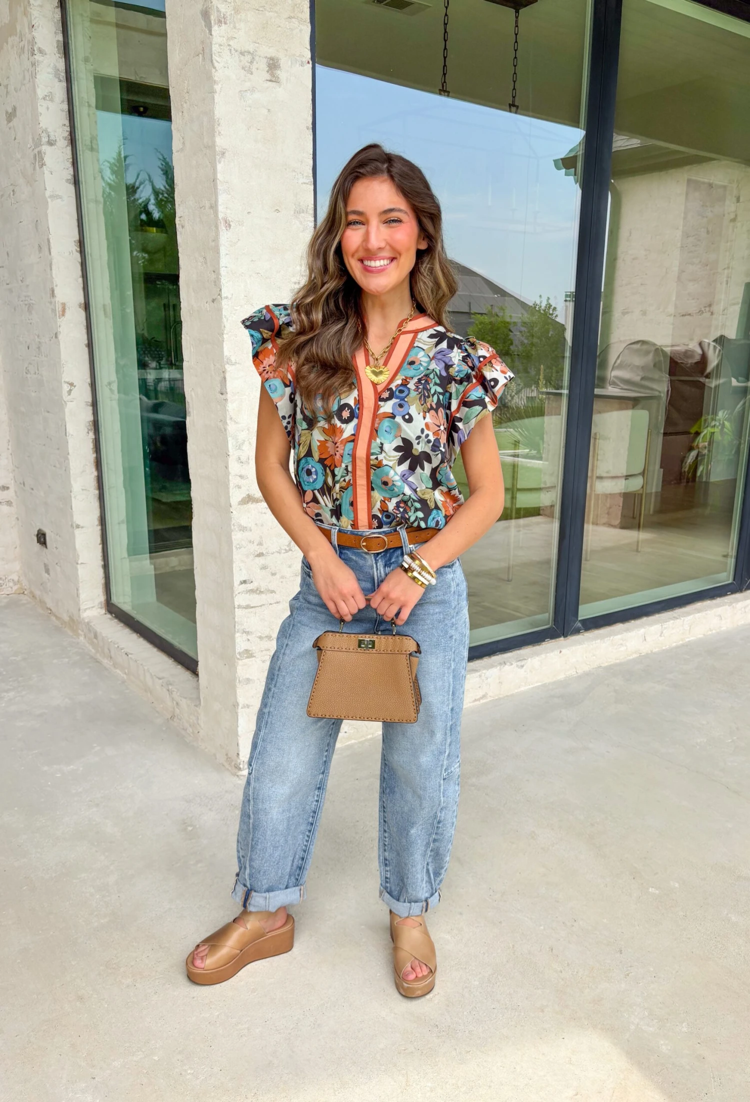 A fresh and flirty floral moment just in time for fall! This flutter sleeve top brings in the prettiest autumn-inspired hues with a bold multicolor print and playful contrast trim at the neckline. It’s lightweight, flowy, and ready to take on pumpkin patches, patios, and everything in between.