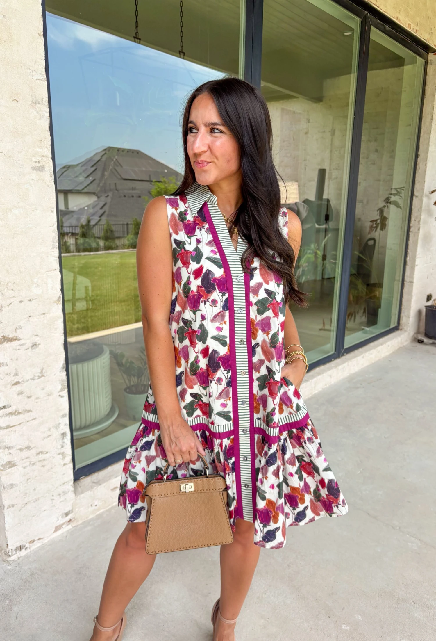 - Features: Ruffle hem, multicolor floral print, contrast spread collar, button front, side pockets