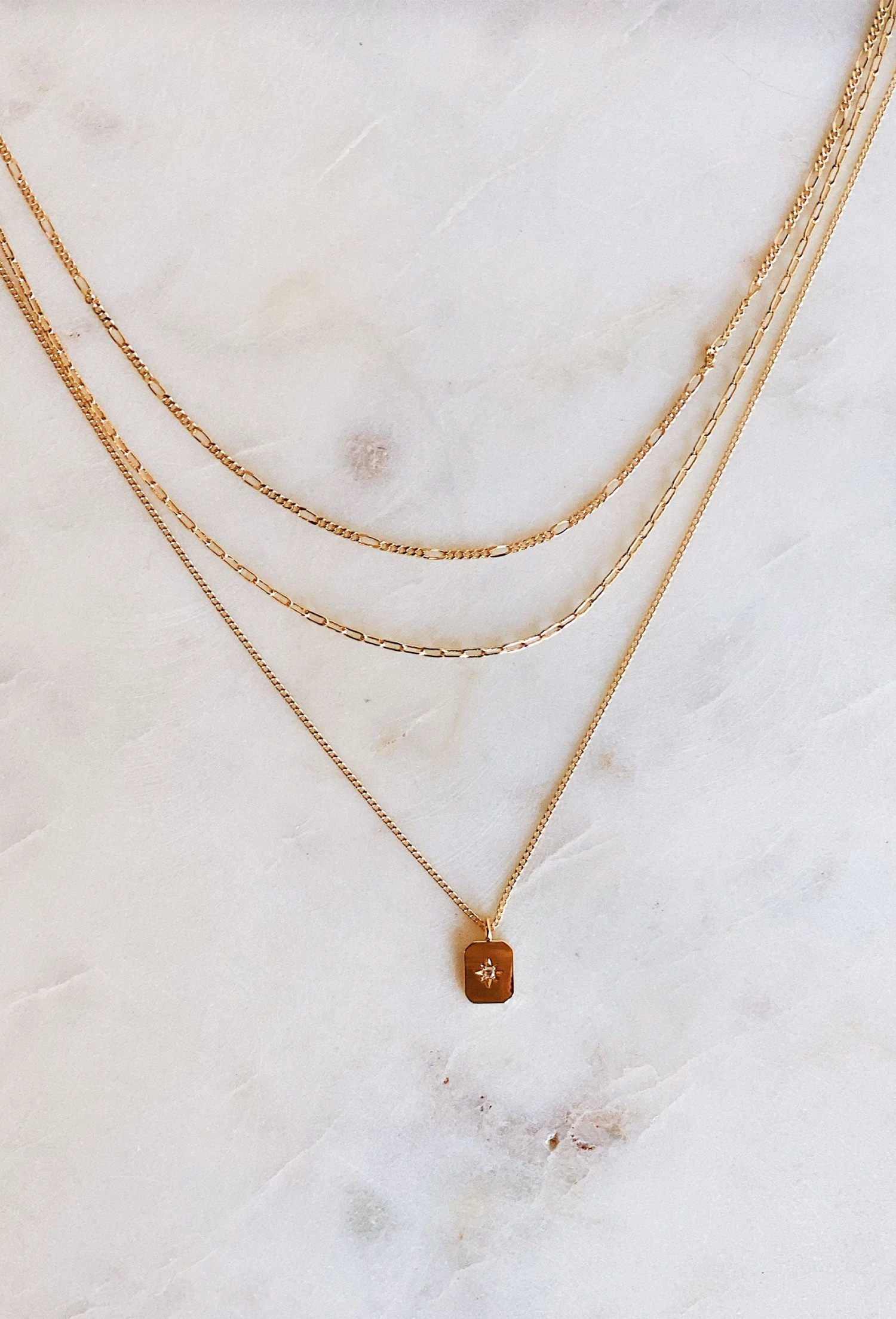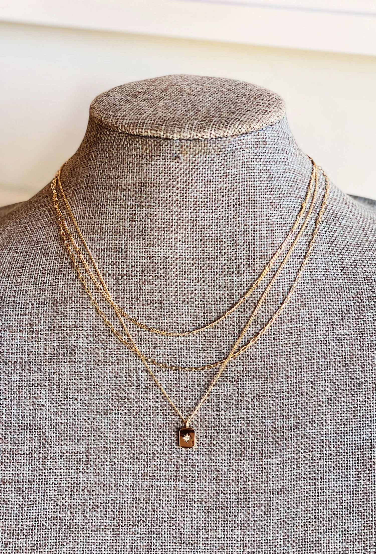 The perfect addition to your everyday ensemble. Great for layering or wearing alone. Three layers of chains and charms adds the right amount of shine to any outfit you desire. An everyday necklace with three layers of unique chains and a crystal star charm. An adjustable chain encourages customization.