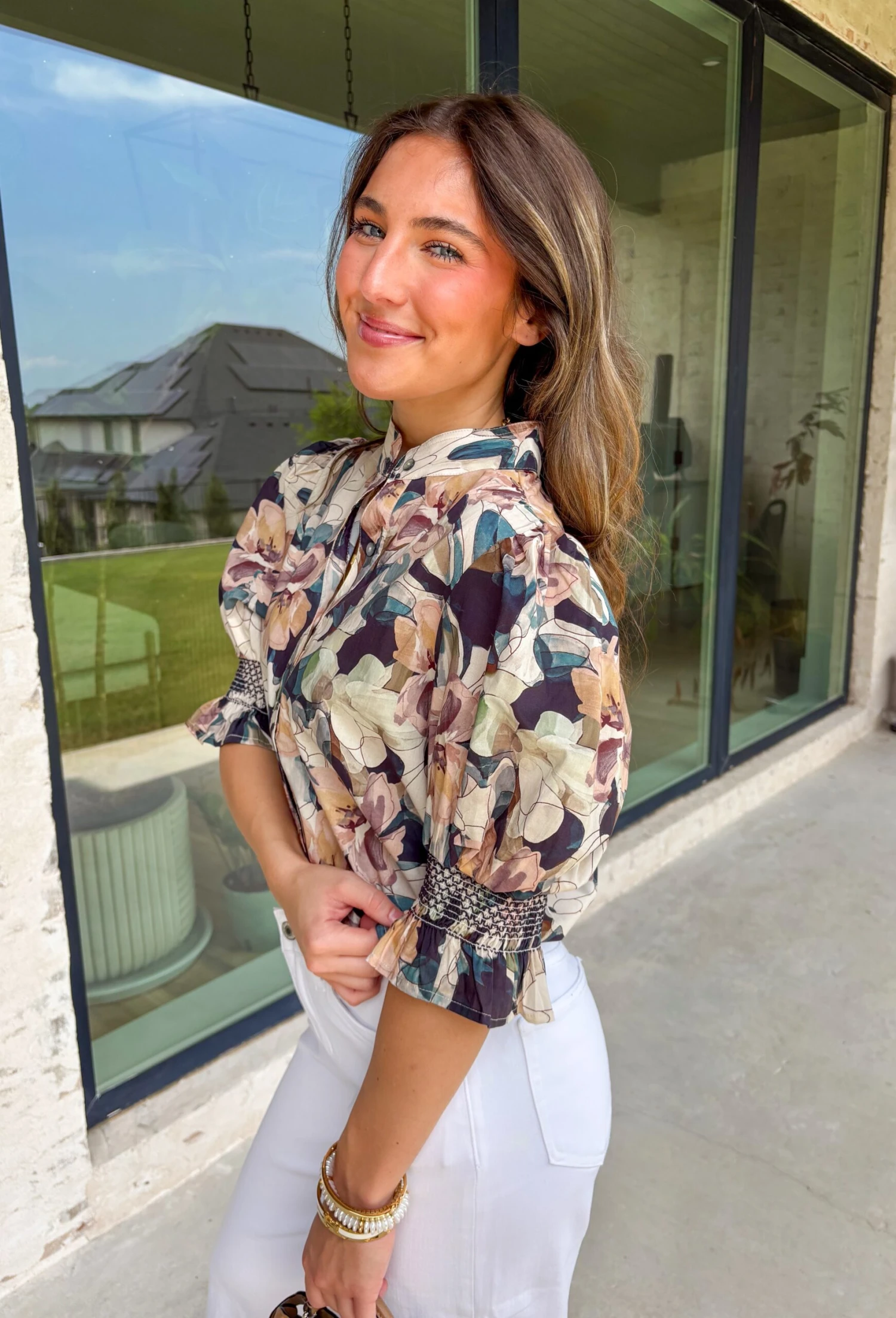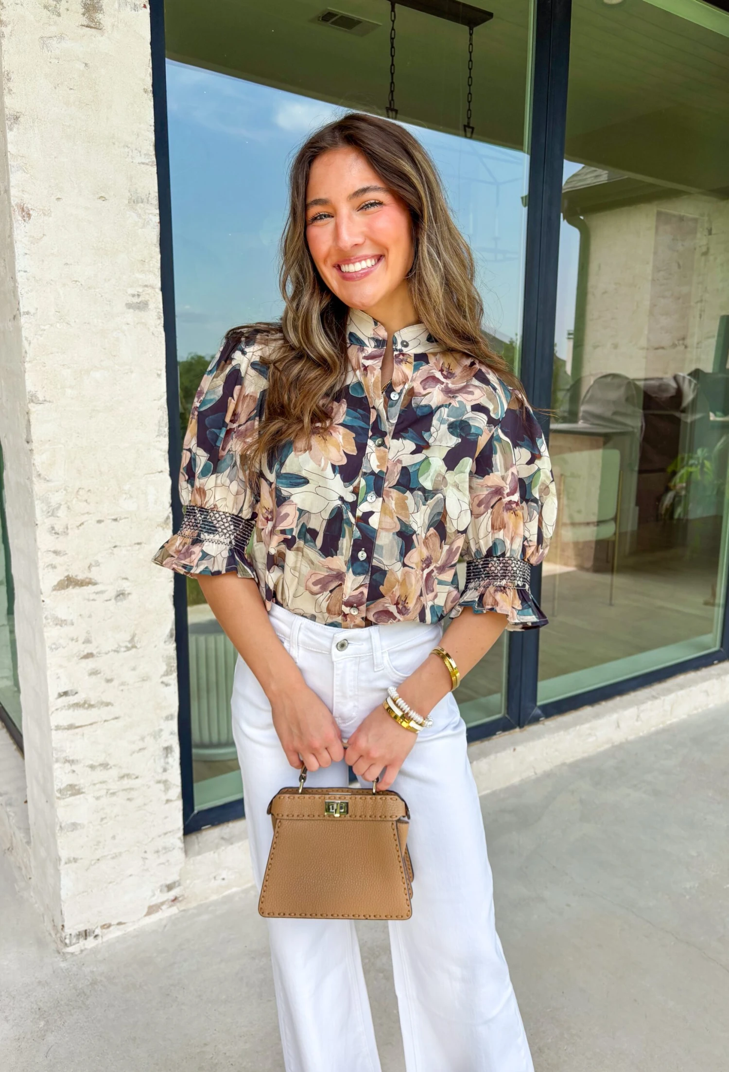 A little structure, a little whimsy—this navy button down brings the best of both. With its neutral-toned abstract floral print in shades of cream, sage, teal, and navy, it’s giving easy elegance with a seasonal twist. Smocked sleeves with ruffle detailing add just the right amount of charm to this fall-ready favorite.