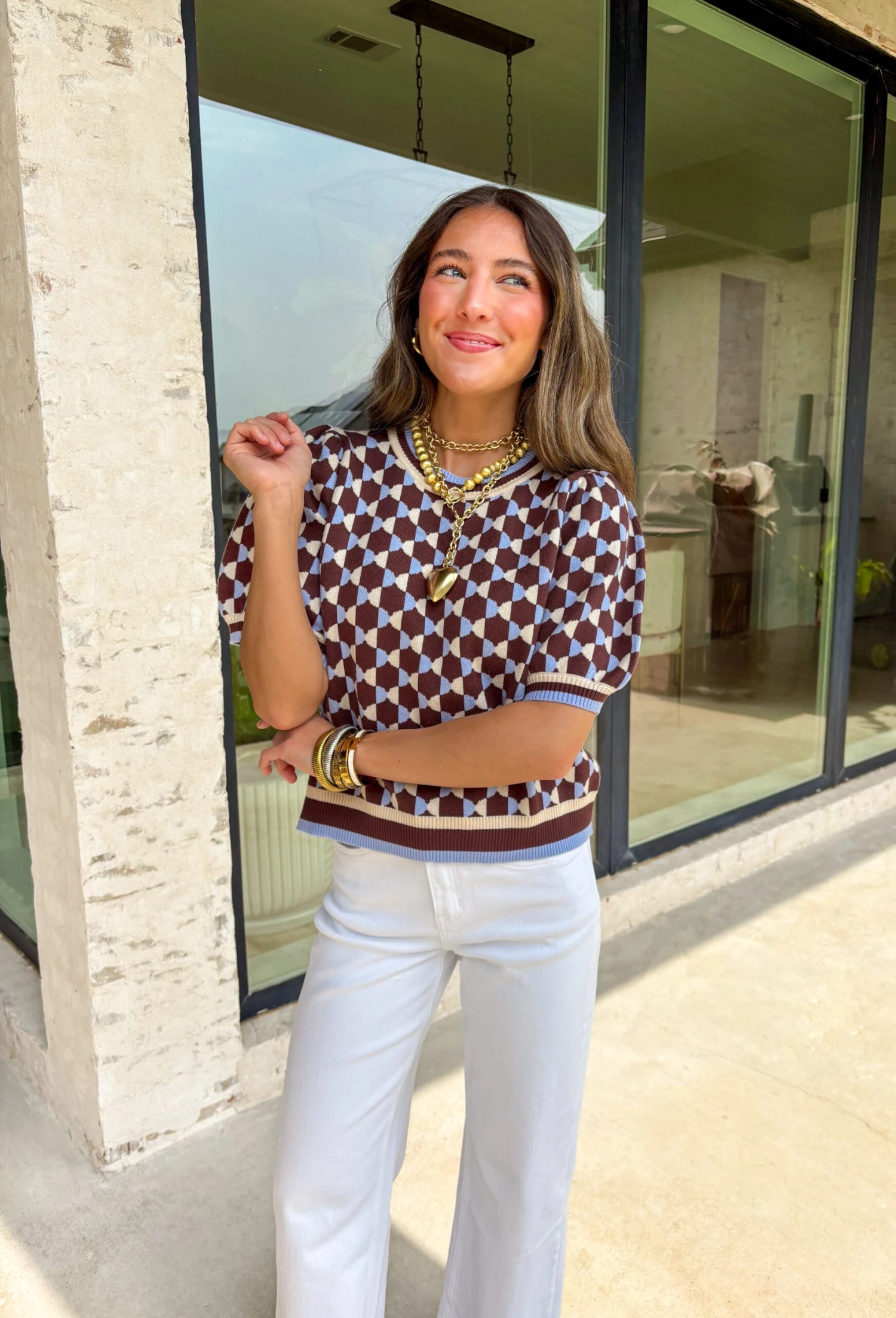 Say hello to your new favorite fall sweater—equal parts artsy, cozy, and just plain cute. With its playful abstract pattern in warm brown, soft cream, and pops of periwinkle, this sweater knit top is a standout piece that still feels totally wearable. The short puff sleeves add a sweet, feminine flair, while the soft blend gives you all the comfort without any bulk. Whether you’re sipping lattes or heading out for a crisp evening walk, this top pairs perfectly with denim, corduroy, or faux leather for a layered-up fall vibe.