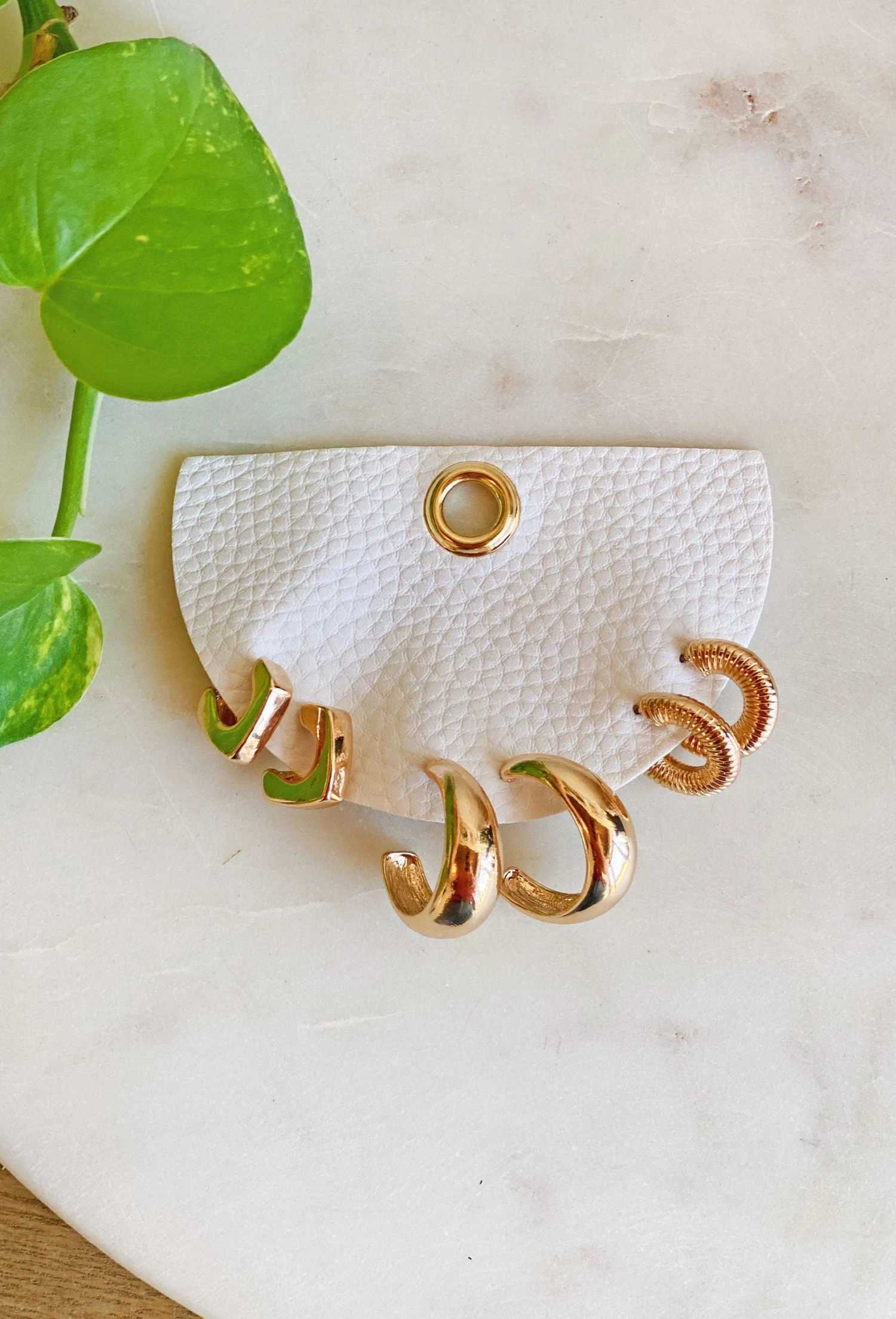 Introducing the Easy Days Earrings Set – a set of three pairs of beautiful gold hoop earrings that will add a touch of elegance to any outfit. Each pair of earrings features a different shape, so you can mix and match to create your own unique look. Whether you’re dressing up for a special occasion or just adding a little something extra to your everyday style, these earrings are the perfect finishing touch.