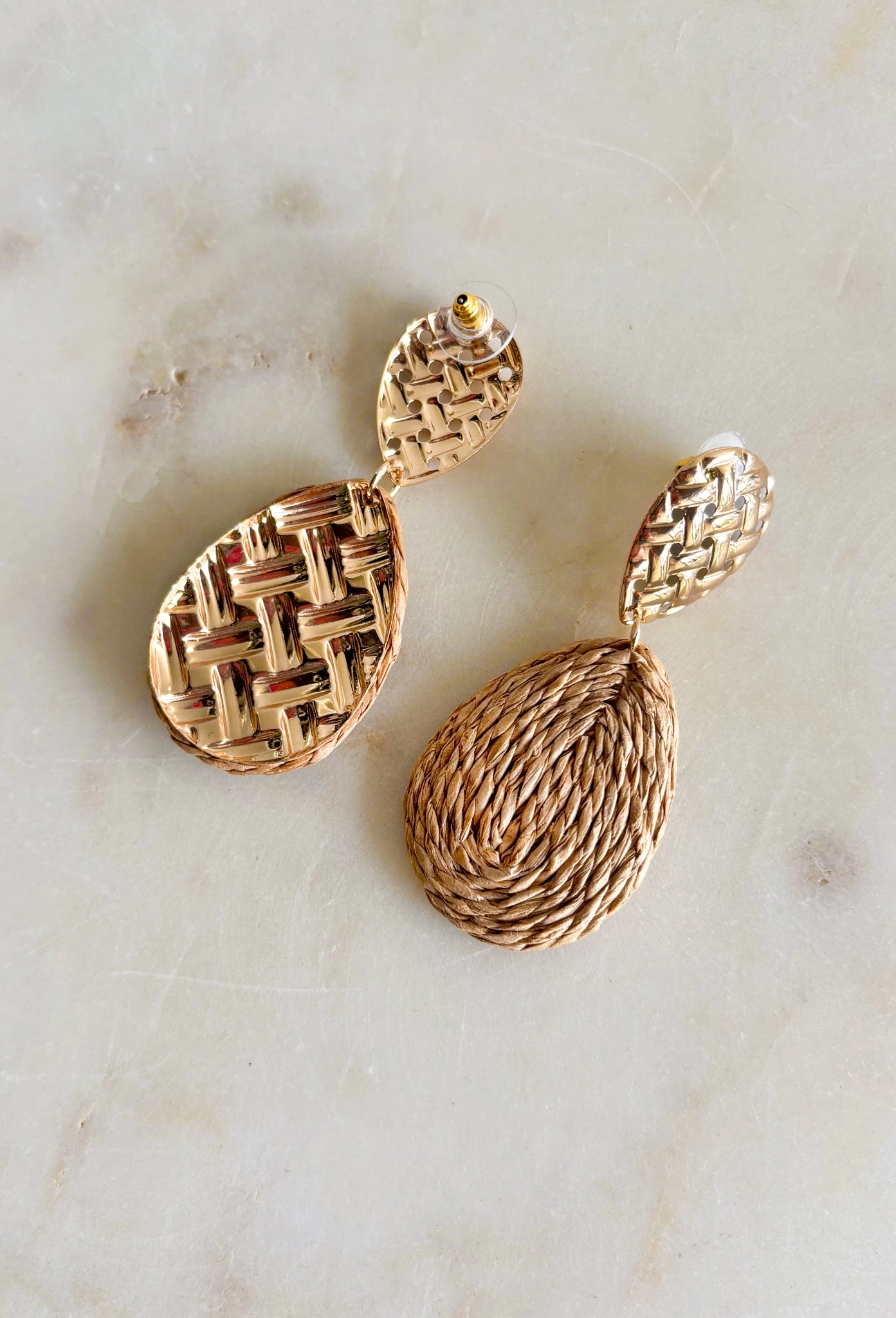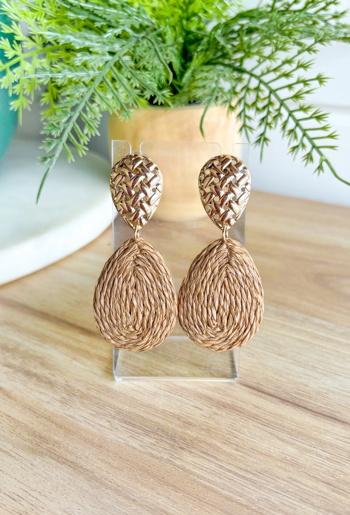 Add a touch of summer to your ensemble with our Endless Love Earrings in Tan. The textured gold teardrop and tan raffia drop add a statement to any outfit.ย