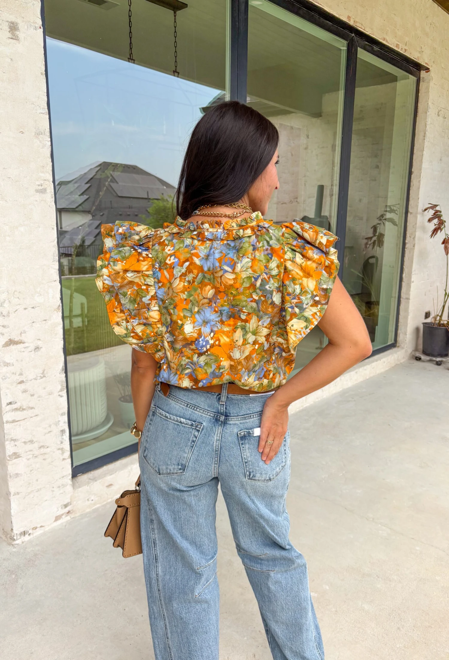 This top is all about autumn charm—tiered flutter sleeves, ruffled neckline, and the prettiest multicolor floral print in rich fall hues. Whether you’re heading to a pumpkin patch or brunch with friends, it’s a feel-good favorite you’ll reach for all season long!