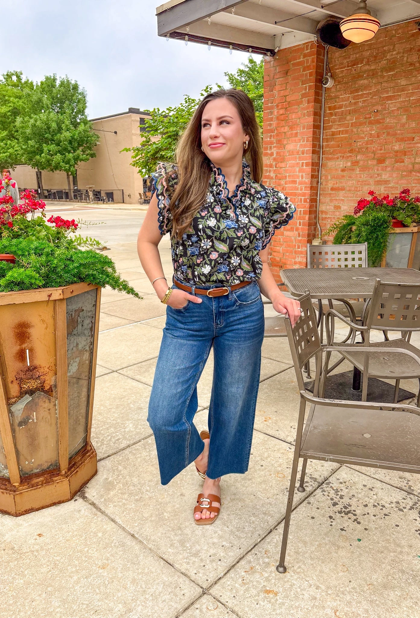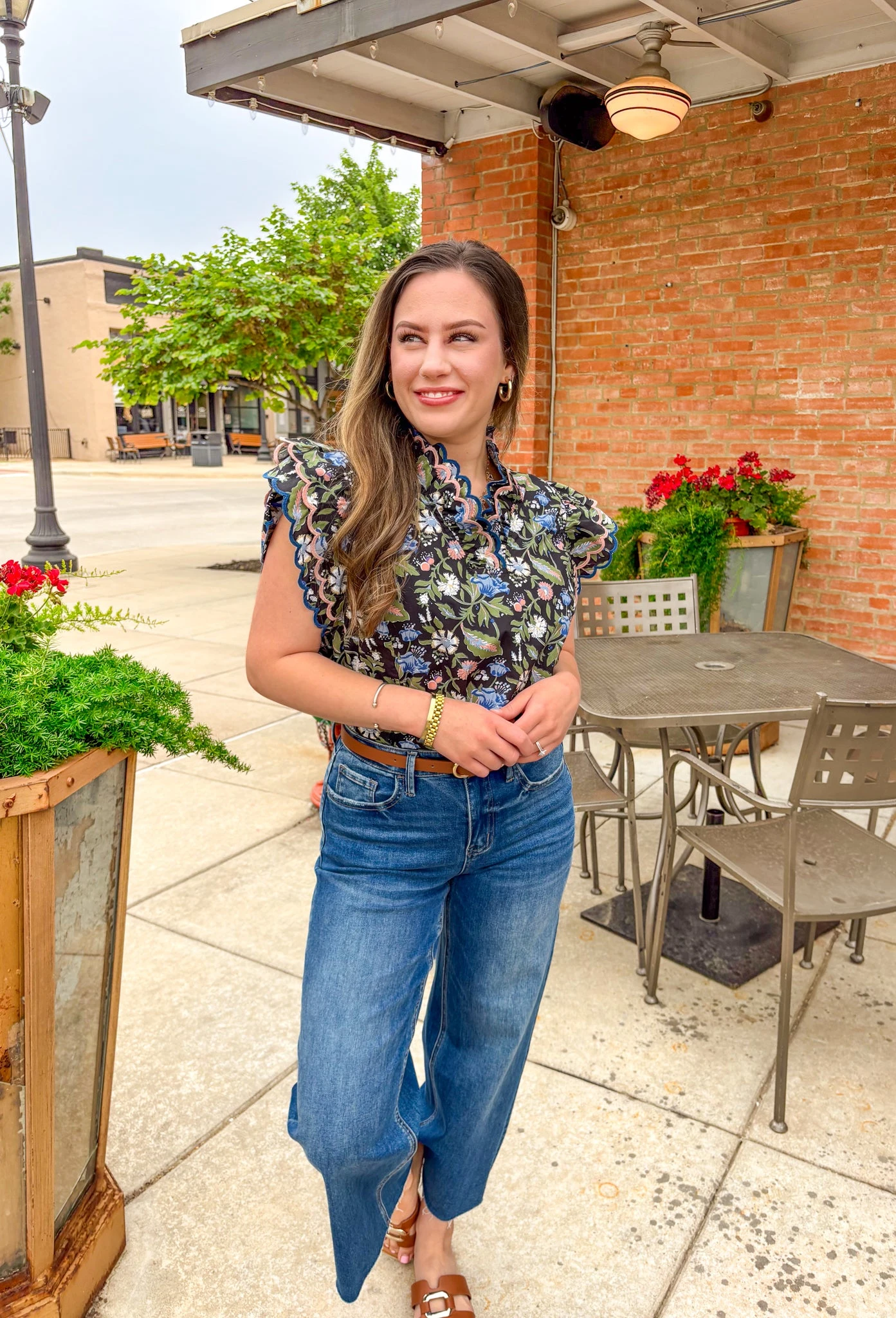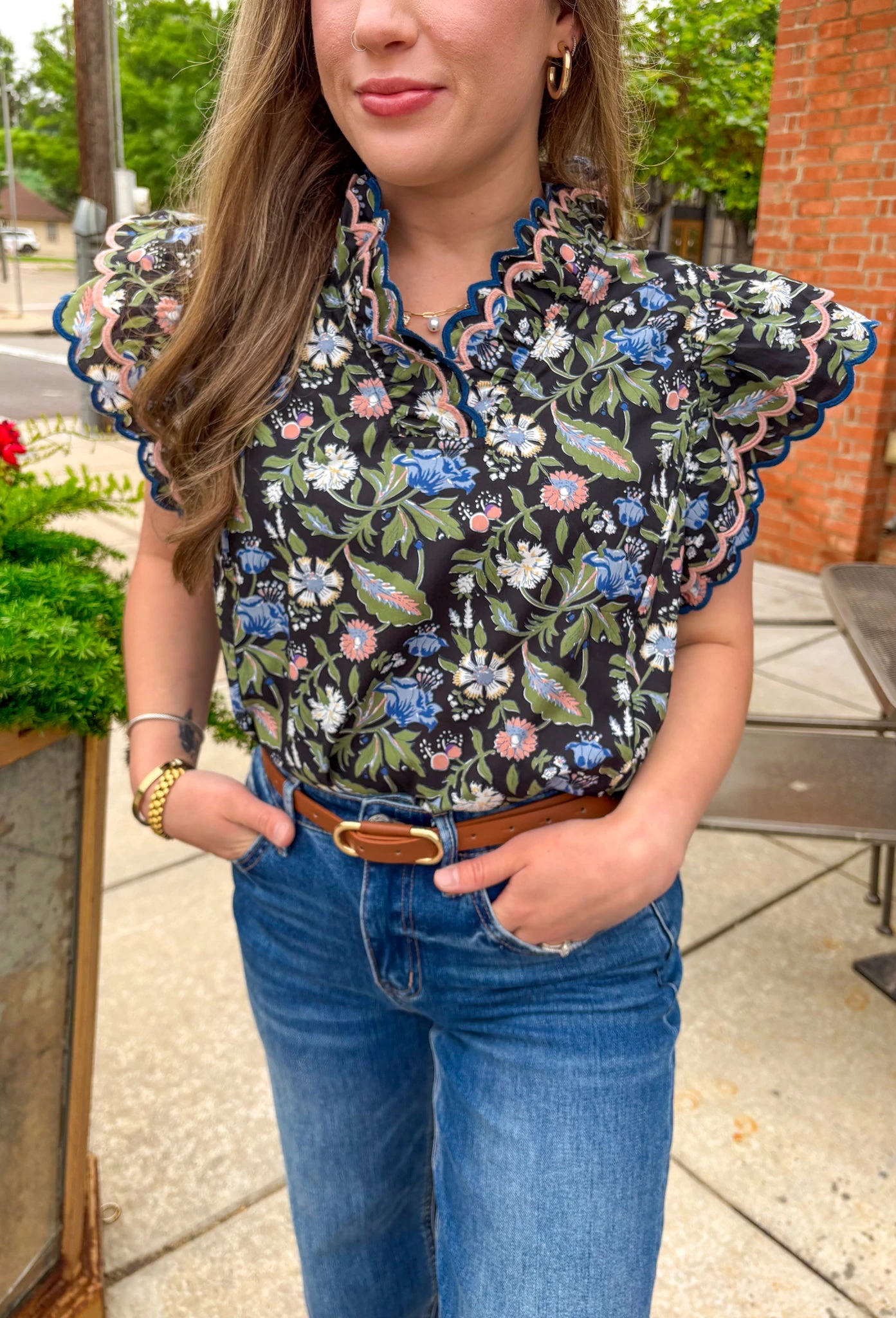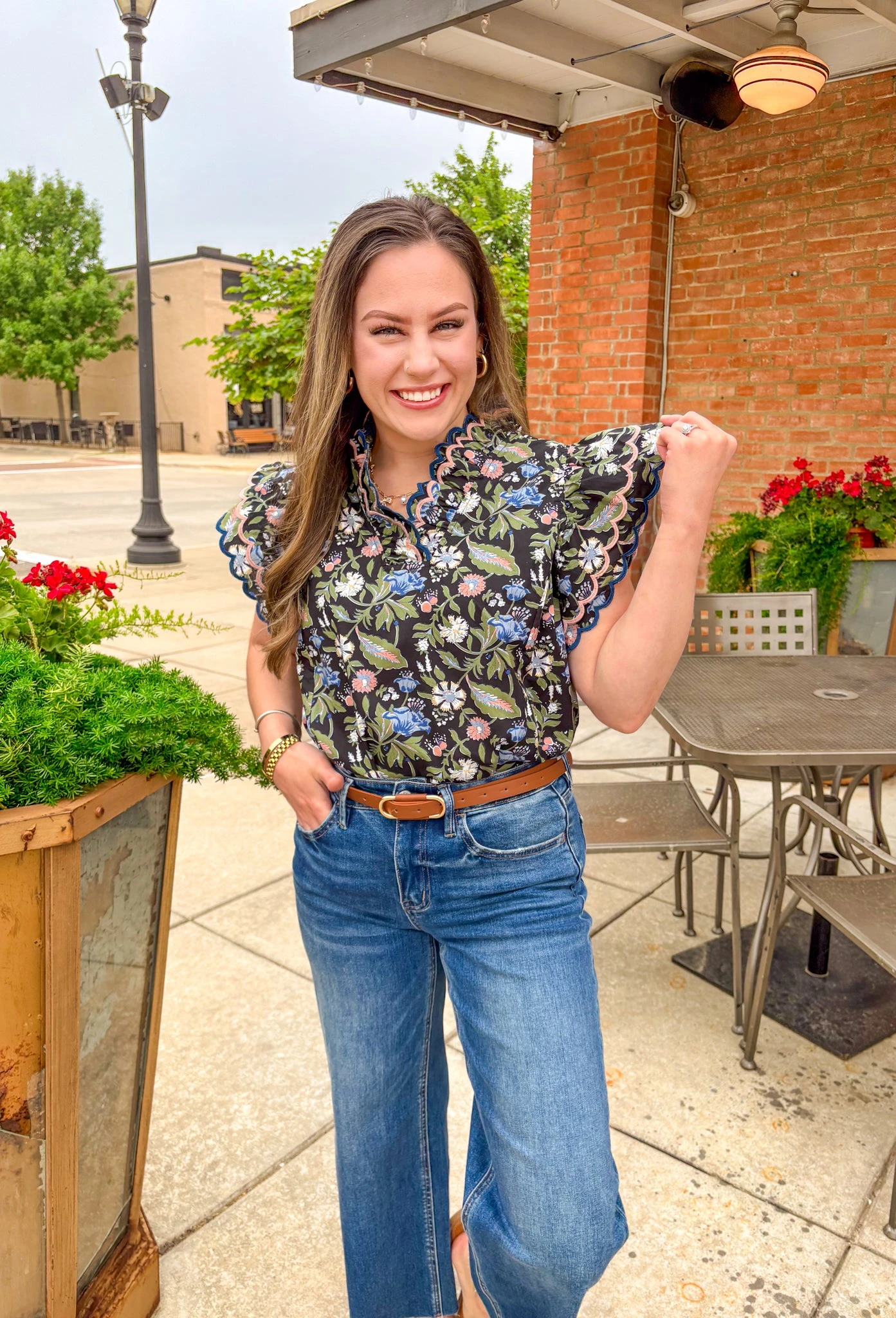 This black floral top by Umgee is giving moody blooms with a playful twist! Covered in a colorful floral print with shades of blue, dark green, mauve, and white, it’s full of charm and detail. The scalloped short sleeves and neckline are finished with beautiful mauve and navy embroidered trim for a polished, feminine touch. Made from breathable 100% cotton, this top is perfect for adding a pop of floral to your everyday look.