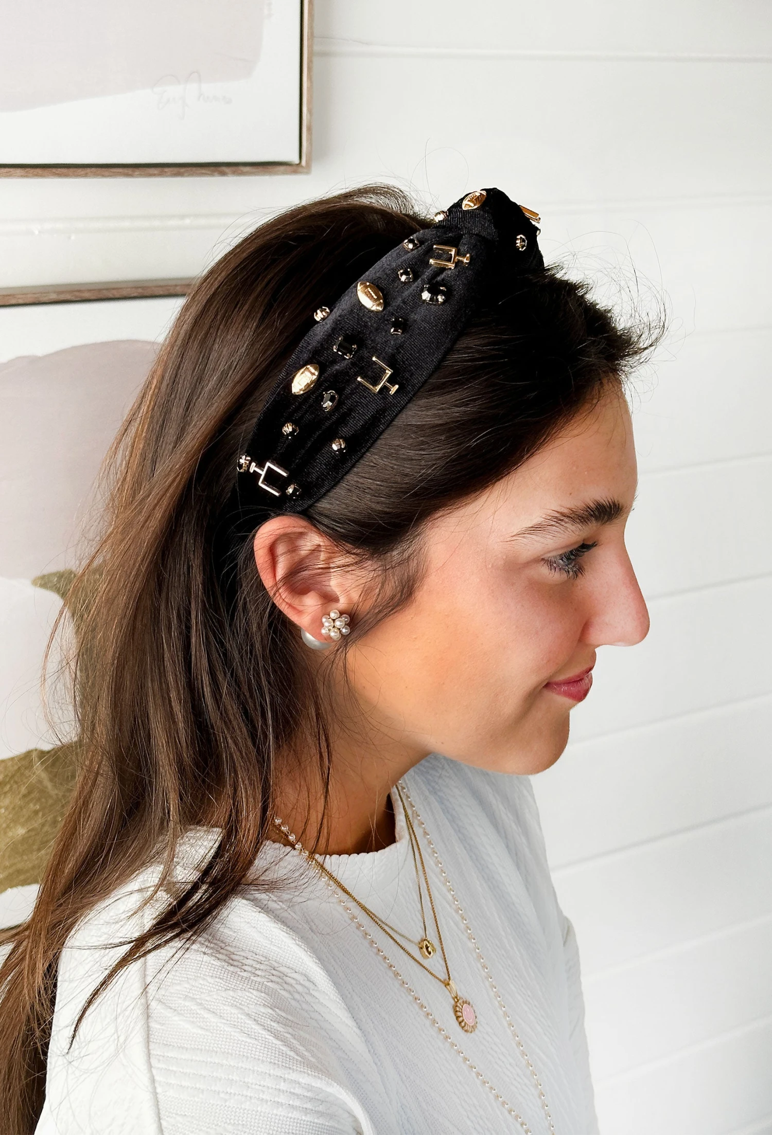 Add a little something to your gameday wardrobe! This black headband with jewels, and football charms will make any tailgate a touchdown!