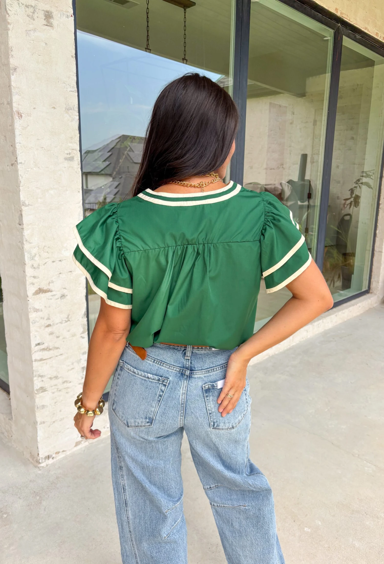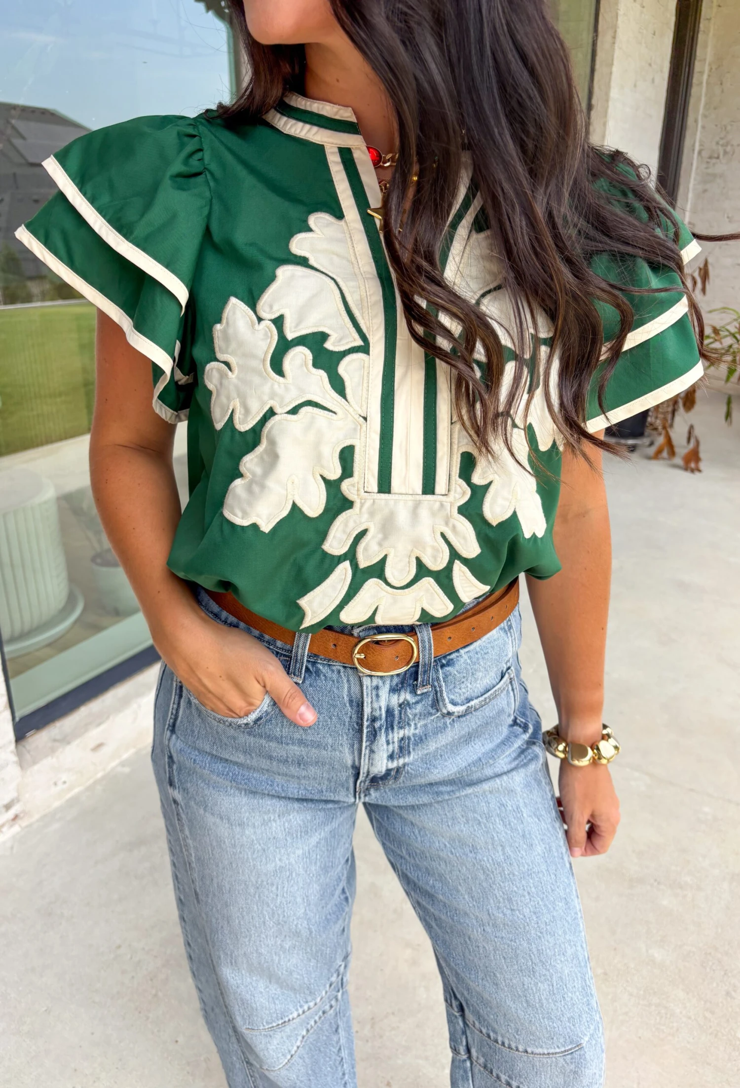 Say hello to your new fall favorite! This pine flutter sleeve top by Entro is a total standout with its bold black embroidered applique on the front and multicolor accents that bring all the seasonal vibes. The lightweight fabric and relaxed v-neckline keep things easy and breezy, while the rich details add just the right touch of flair.