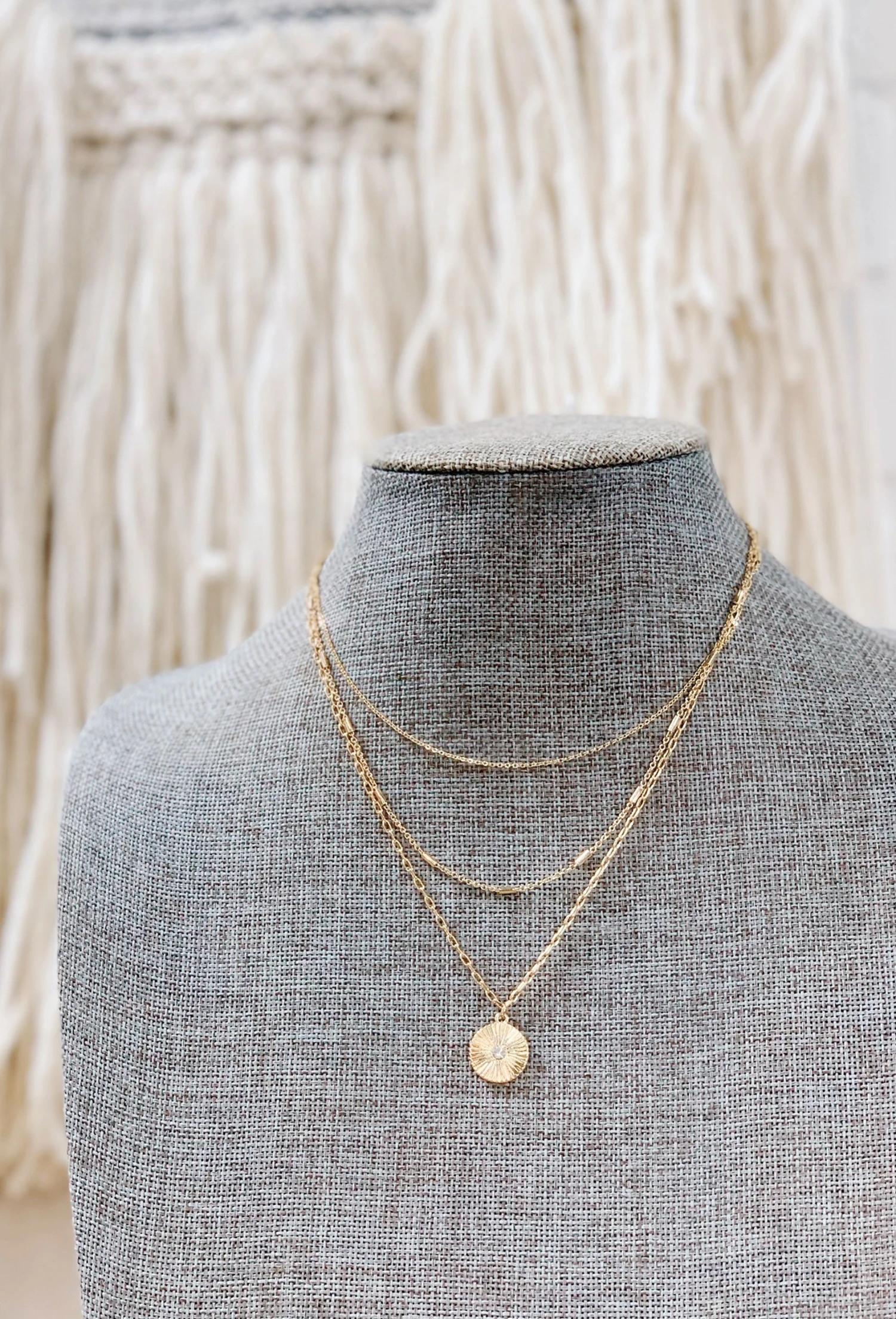 Catch the eyes of everyone around you with the Gold Catch the Light Necklace. Add this layered necklace to your accessory collection for a fast and easy way to dress up up your OOTD! This shiny gold necklace features a three-layered design that features gold chains with unique textures and a circular crystal charm.
