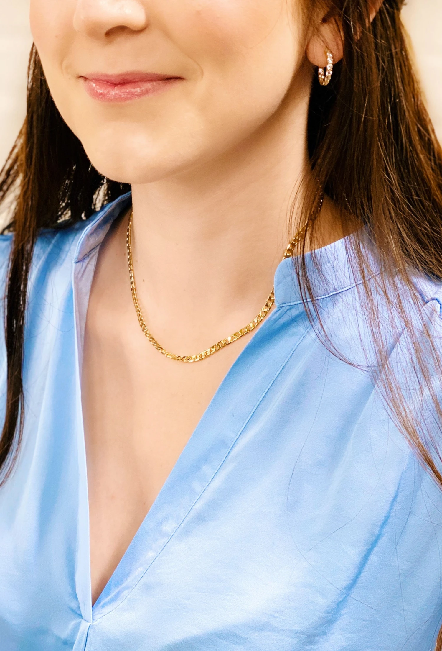 Equal parts feminine and fun, the Gold Dainty Chain Necklace is a piece no jewelry lover should be without. Combining a simple silhouette with a sleek shine, this necklace is a glamorous addition to any outfit. We love this short necklace because of its lightweight, yet girly feel. Layer with other statement pieces in your collection for even more drama.