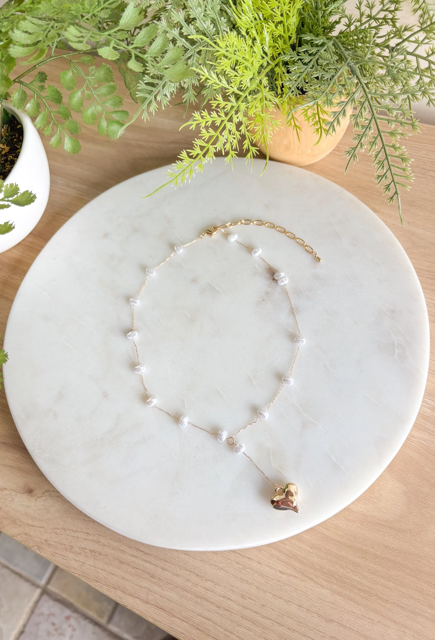 - Features: Dainty gold lariat style, pearl accents, gold heart charm at the drop