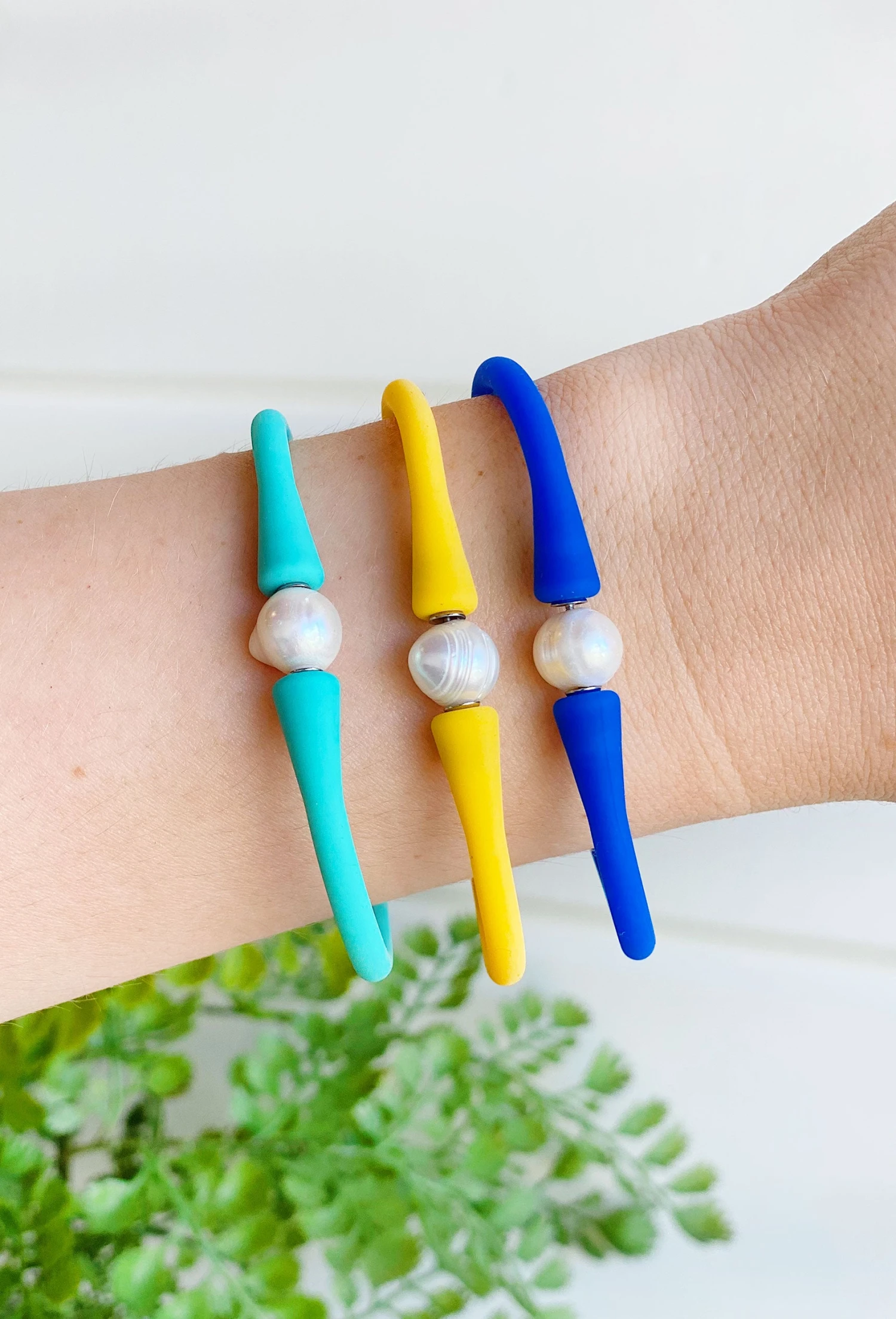 The Hidden Treasure Bracelet in Turquoise is an easy-to-wear accessory with a bold pop of color. Crafted with mother of pearl detail, this pull on style bracelet is perfect for making a statement this summer. Available in multiple colors, this classic piece will be the perfect addition to your wardrobe.