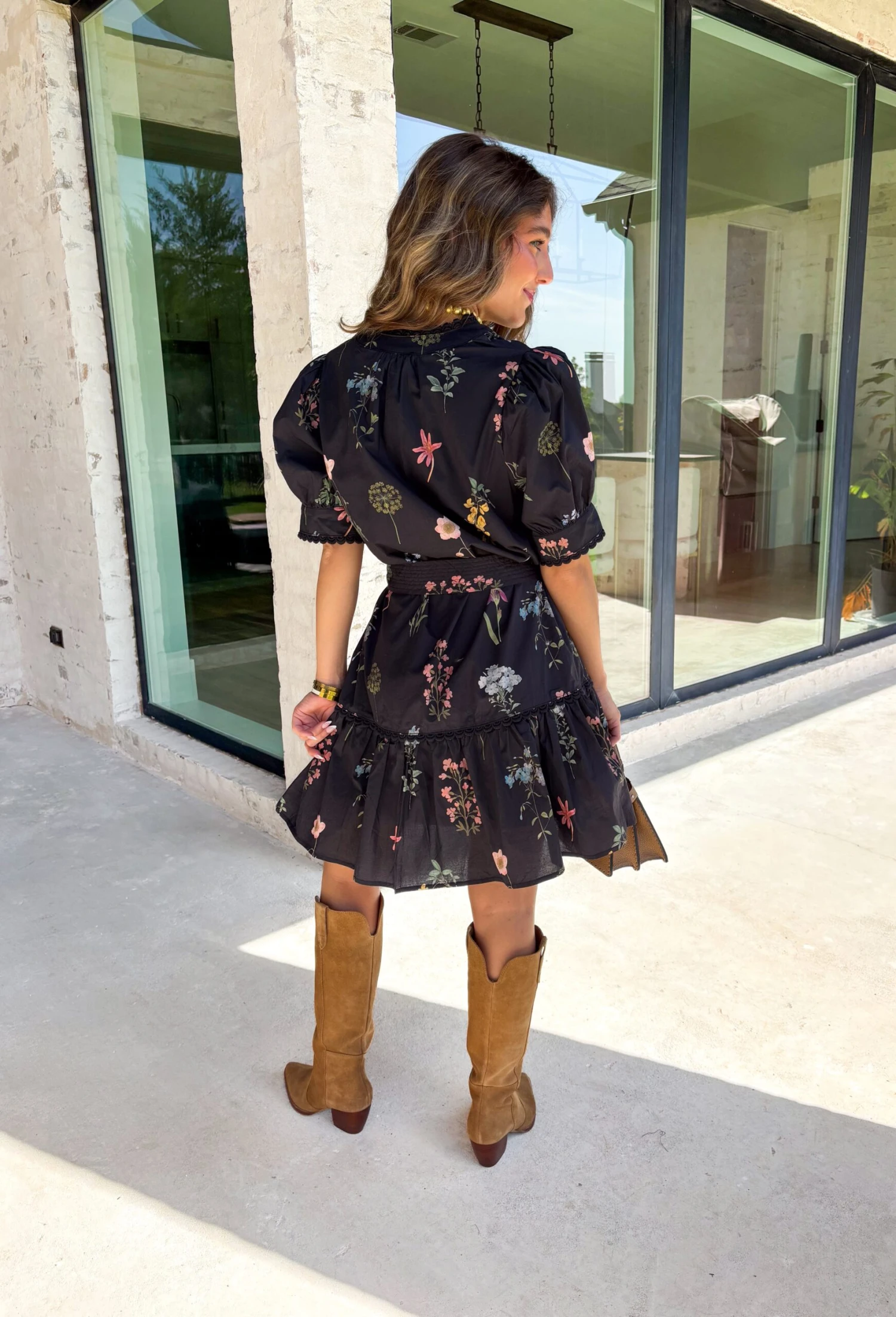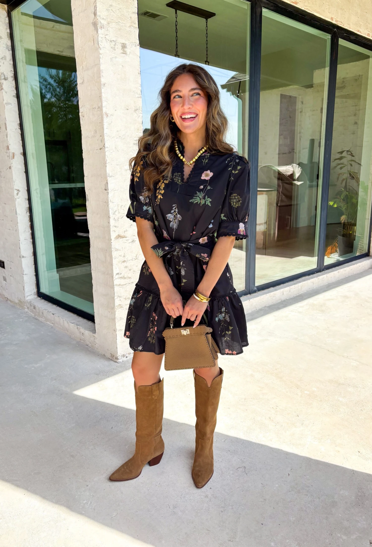 Flirty meets fall in this black floral dress that’s perfect for any occasion. With sweet scalloped trim at the neckline, sleeves, and hem, plus playful puff sleeves and a removable self-tie belt, it’s the kind of dress that does it all. Bonus: it has pockets. We’re in love.