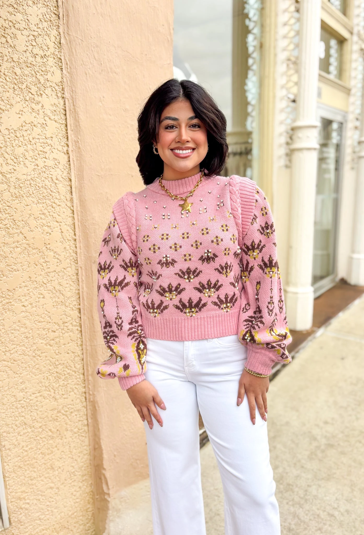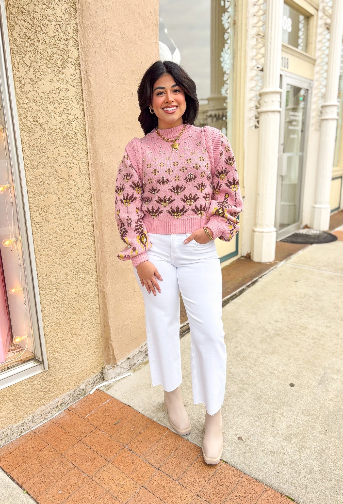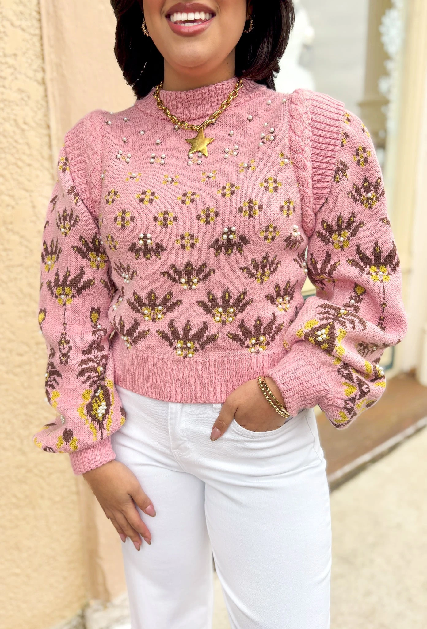 Elevate your wardrobe with our Hope Of It All sweater! The mauve color and neutral print add a touch of elegance, while the pearl detailing adds a touch of glamour. Stay cozy and chic in this must-have piece!