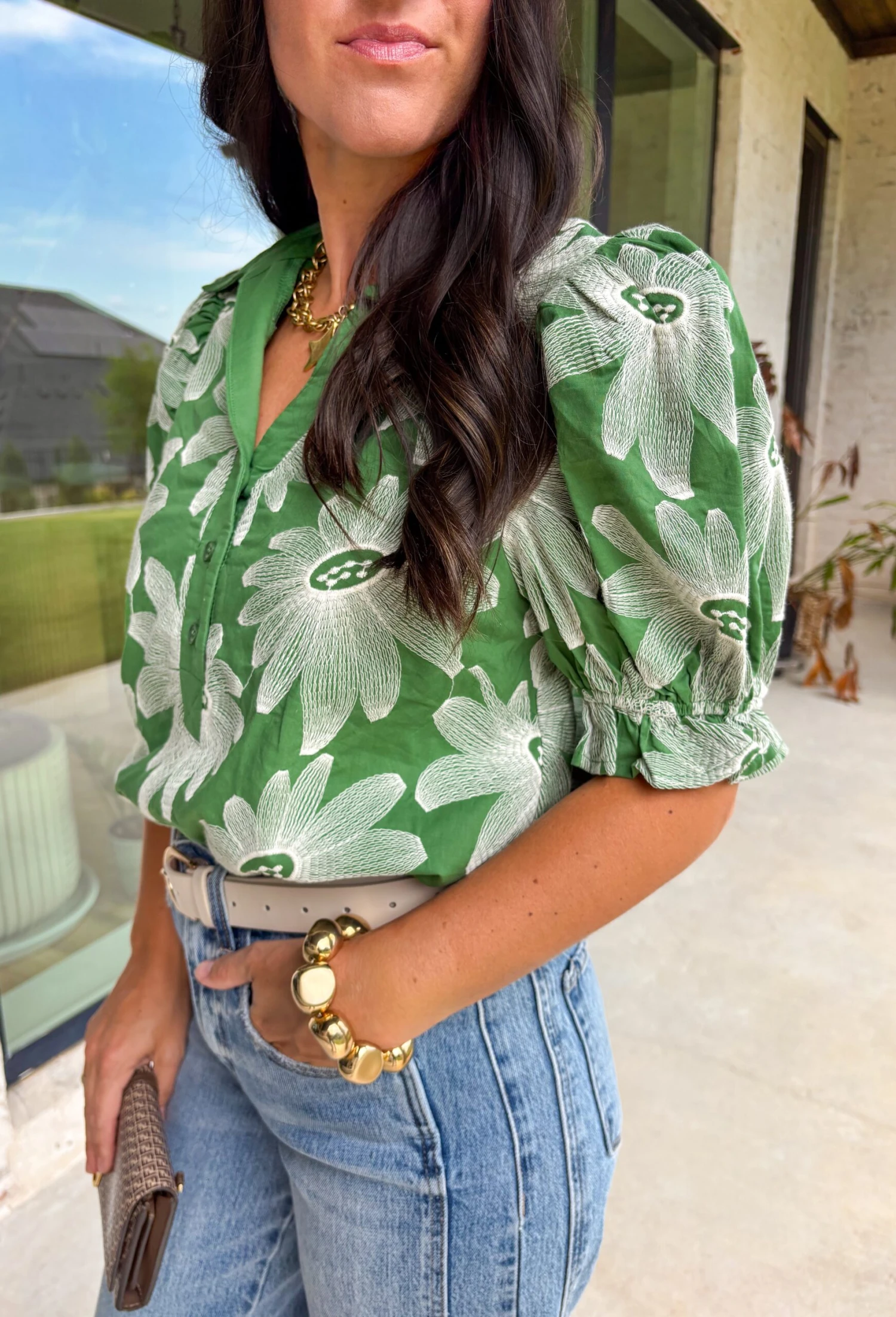 Delicate florals meet cozy fall flair in this sweet puff sleeve top. The embroidered details pop against the rich green backdrop, while the contrast collar adds just the right touch of charm. You’ll find yourself reaching for this top all season long.