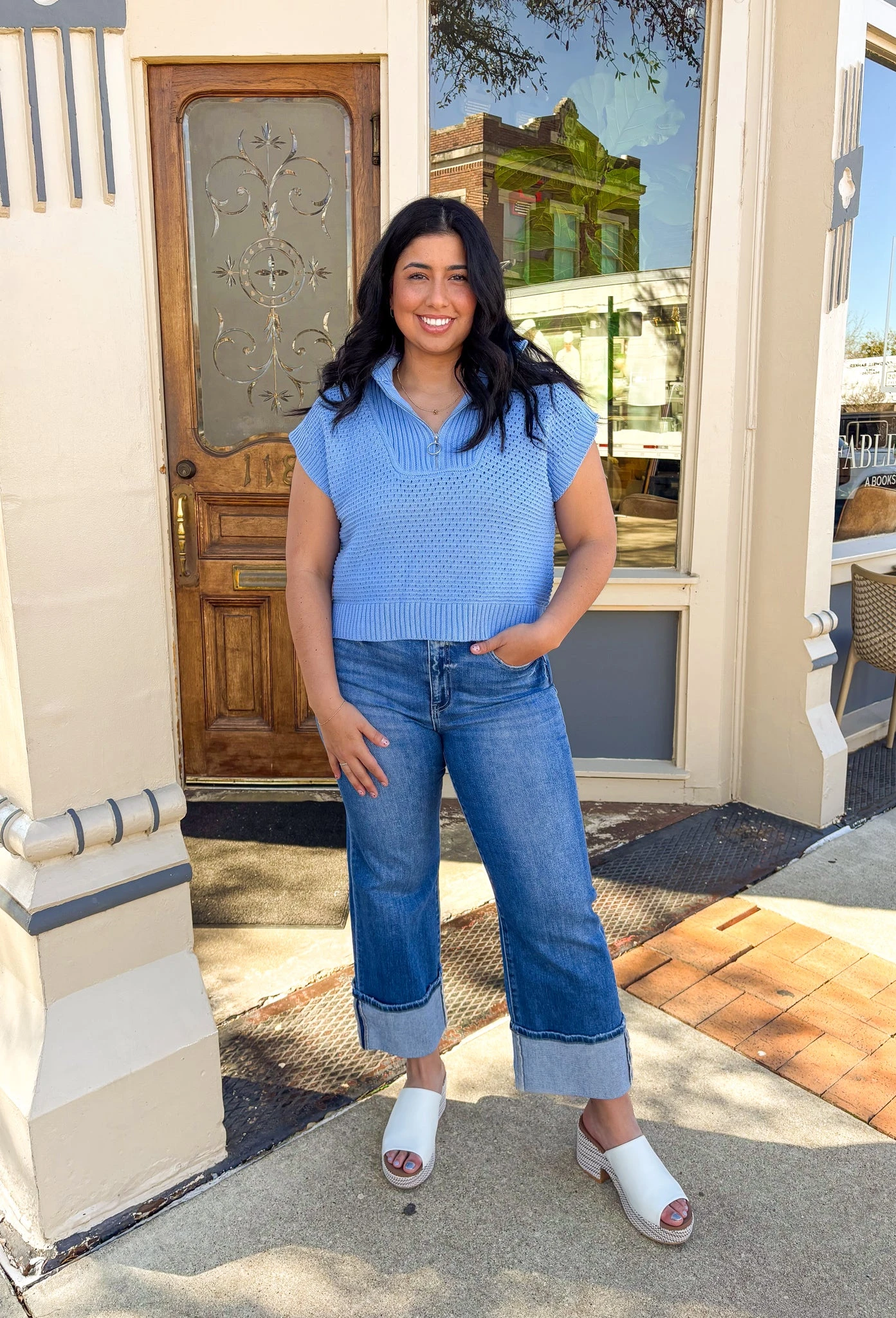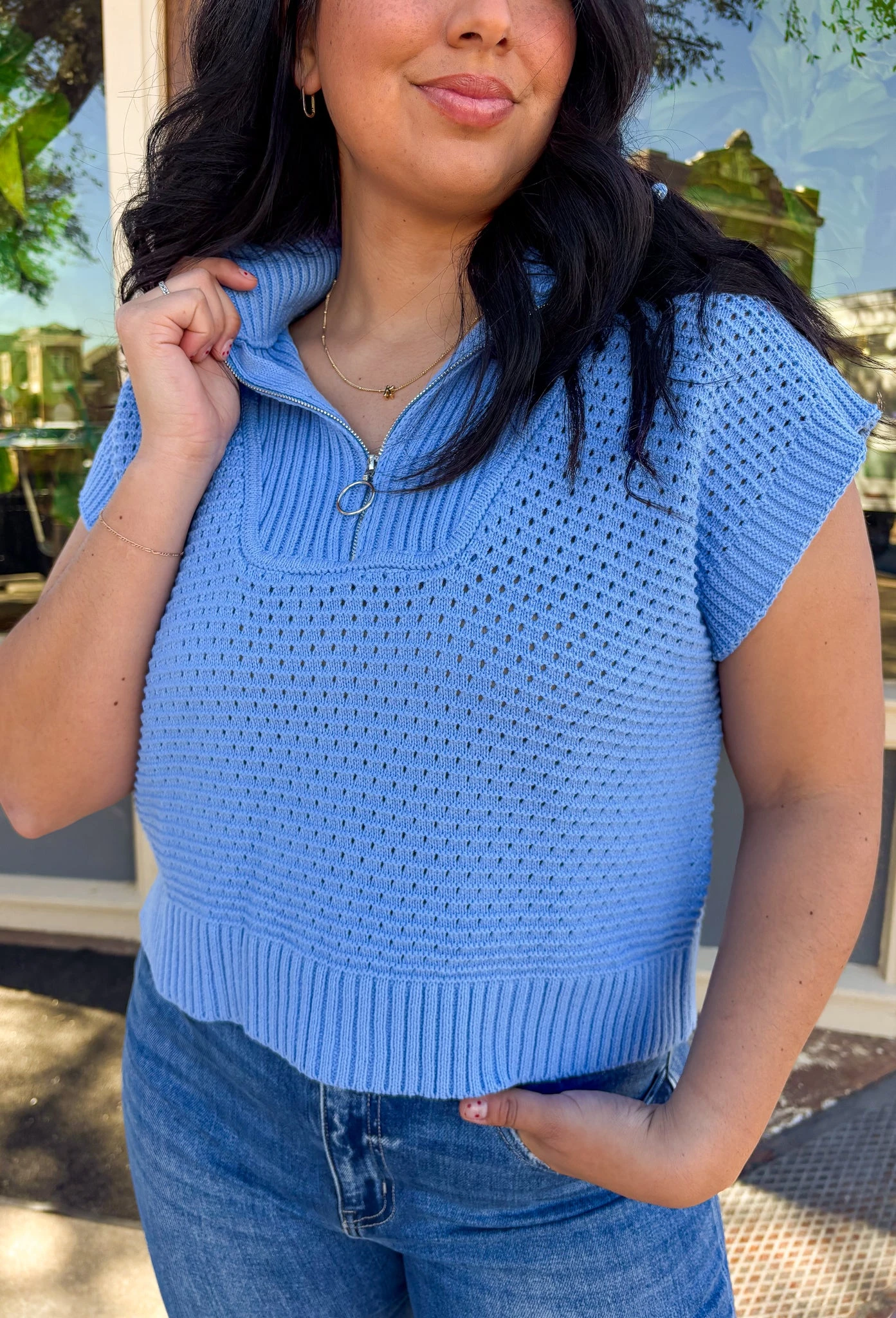 Light and airy with a touch of sporty charm, this beautiful blue short sleeve open knit sweater is the perfect layering piece. Designed with a high neck band and a front half-zipper closure, this sweater effortlessly blends casual and chic. Made by Entro from a breathable acrylic-cotton blend, it’s soft, lightweight, and ideal for transitioning between seasons. Pair it with denim for an easygoing look or layer it over a tank for added dimension.