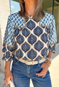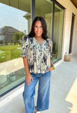 A timeless autumn floral with a touch of texture—this top features a neutral background scattered with rich navy blooms for a look that’s warm and inviting. Smocked short puff sleeves add a feminine shape, while pintuck detailing brings subtle structure to the relaxed fit. Crafted in a soft blend with linen for breathability, this pullover style is perfect for layering under jackets or pairing with your favorite jeans for an easy yet polished fall look.