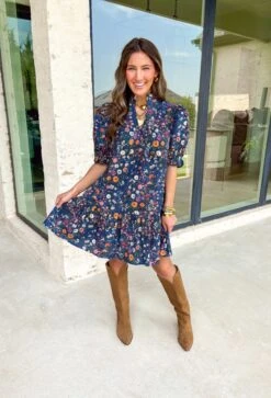 This darling floral mini dress is giving us major fall garden party vibes! With its sweet ruffle hem and puff sleeves, it’s the kind of outfit that instantly makes you feel cute and put together. The colorful dainty floral print pops beautifully against the navy background—perfect for everything from family photos to weekend brunch.