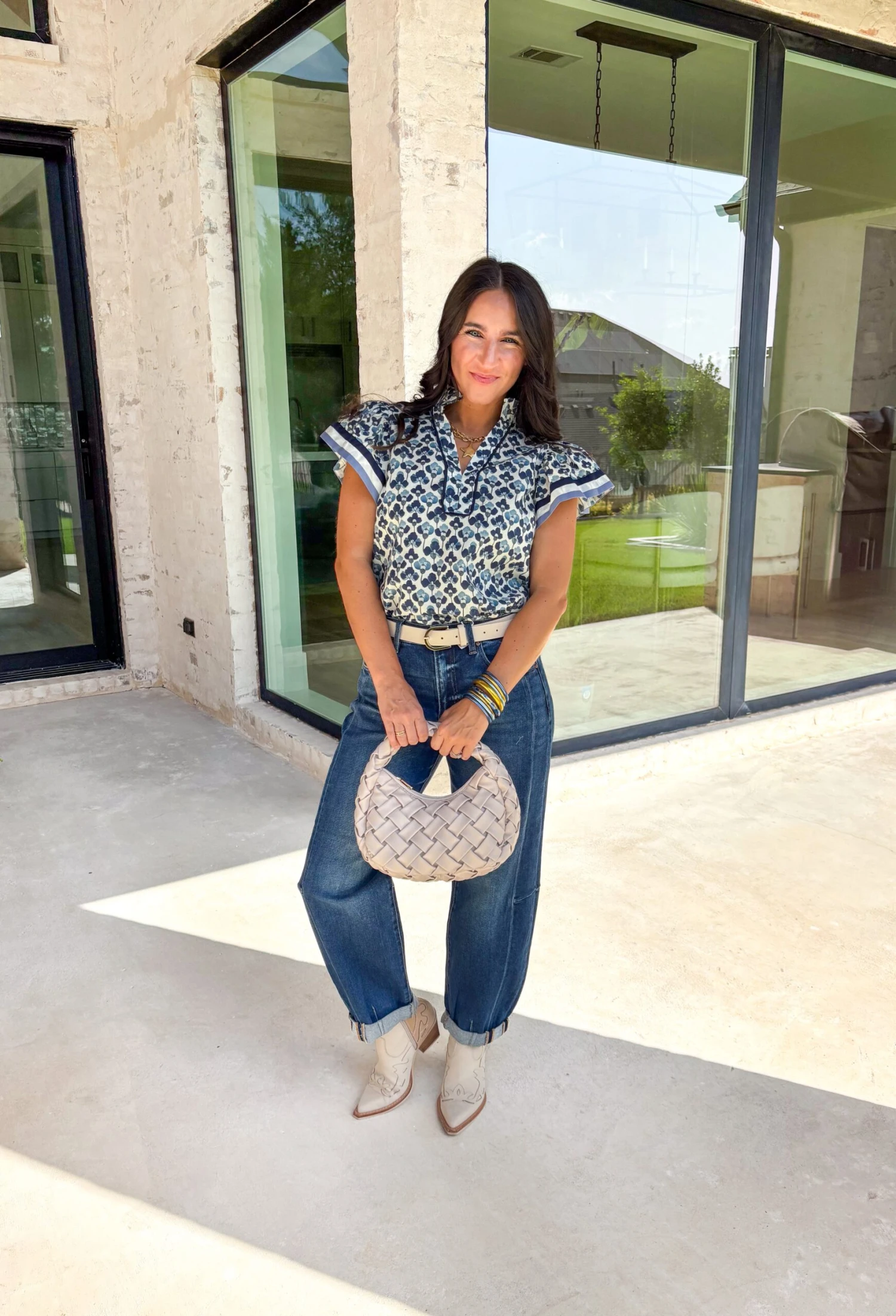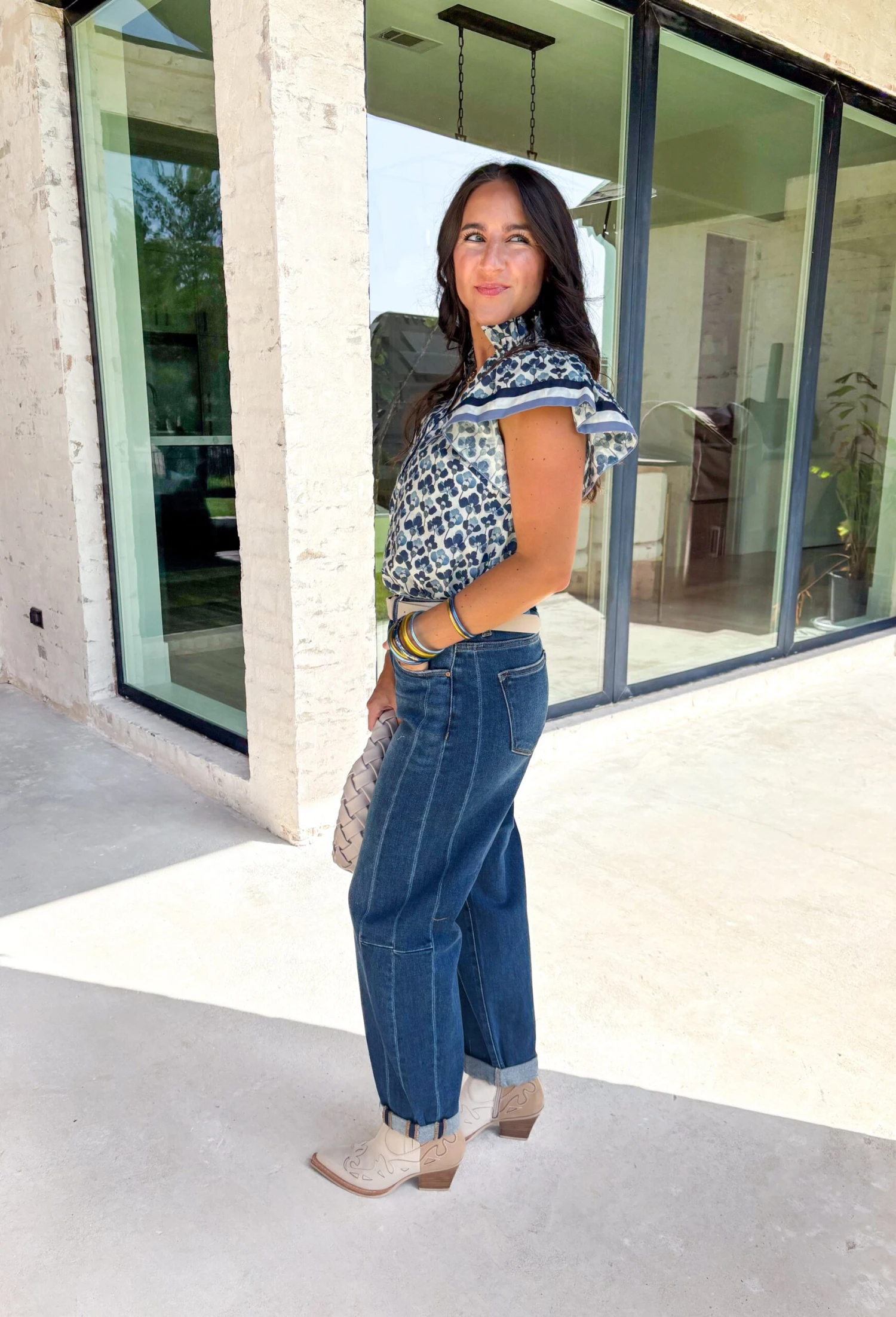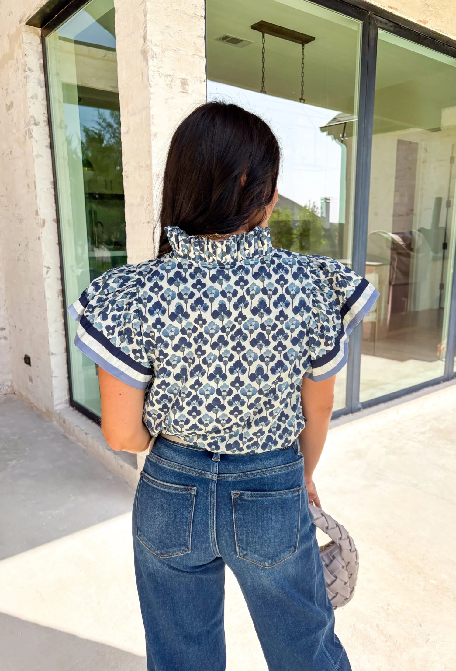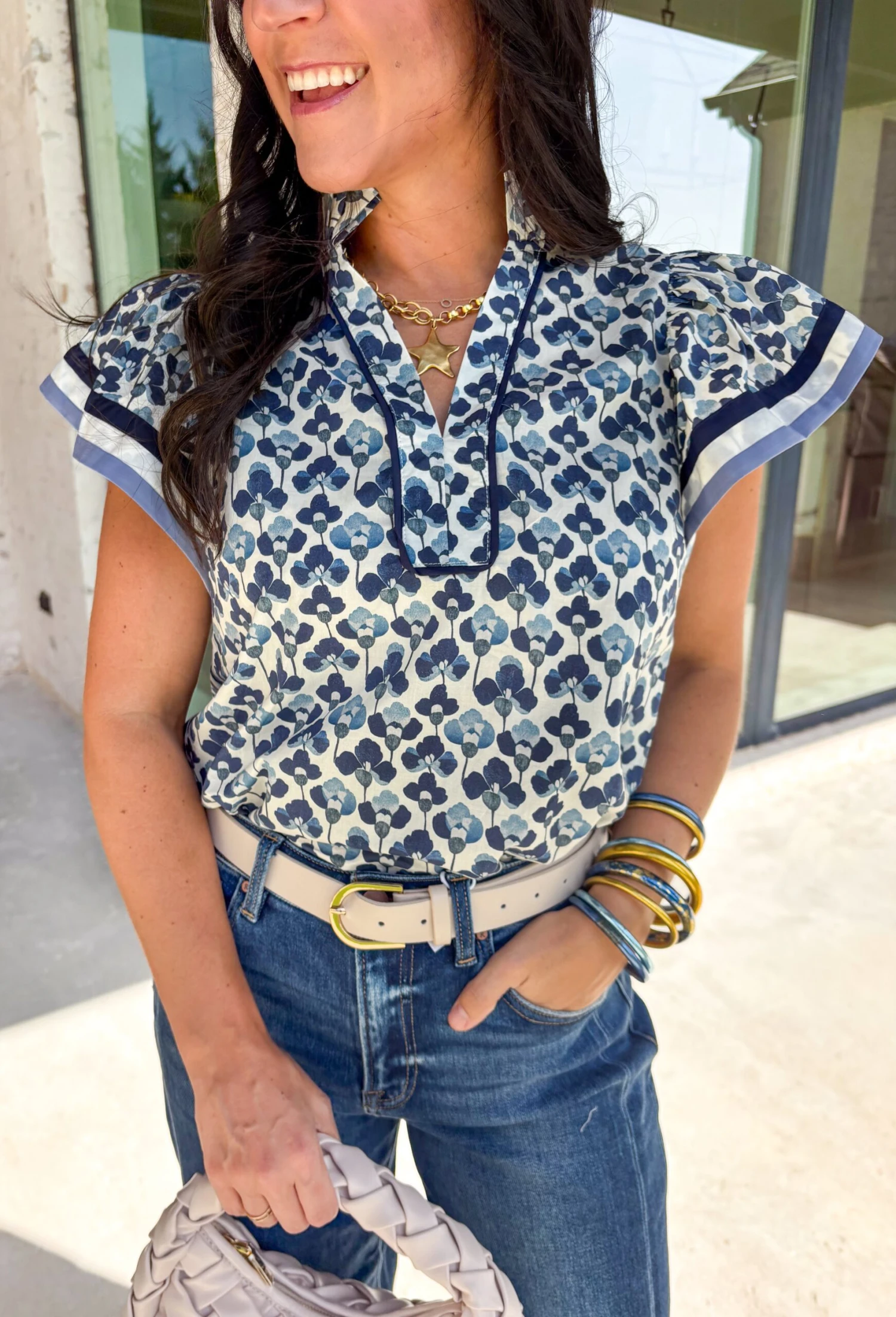 This floral pullover top is all about fun details and fall charm. With a navy and off-white floral print and a high ruffle split v-neckline, it’s the perfect mix of sweet and stylish. The multicolor hem flutter sleeves add a playful finish that’s ready for everything from weekday errands to weekend coffee runs.