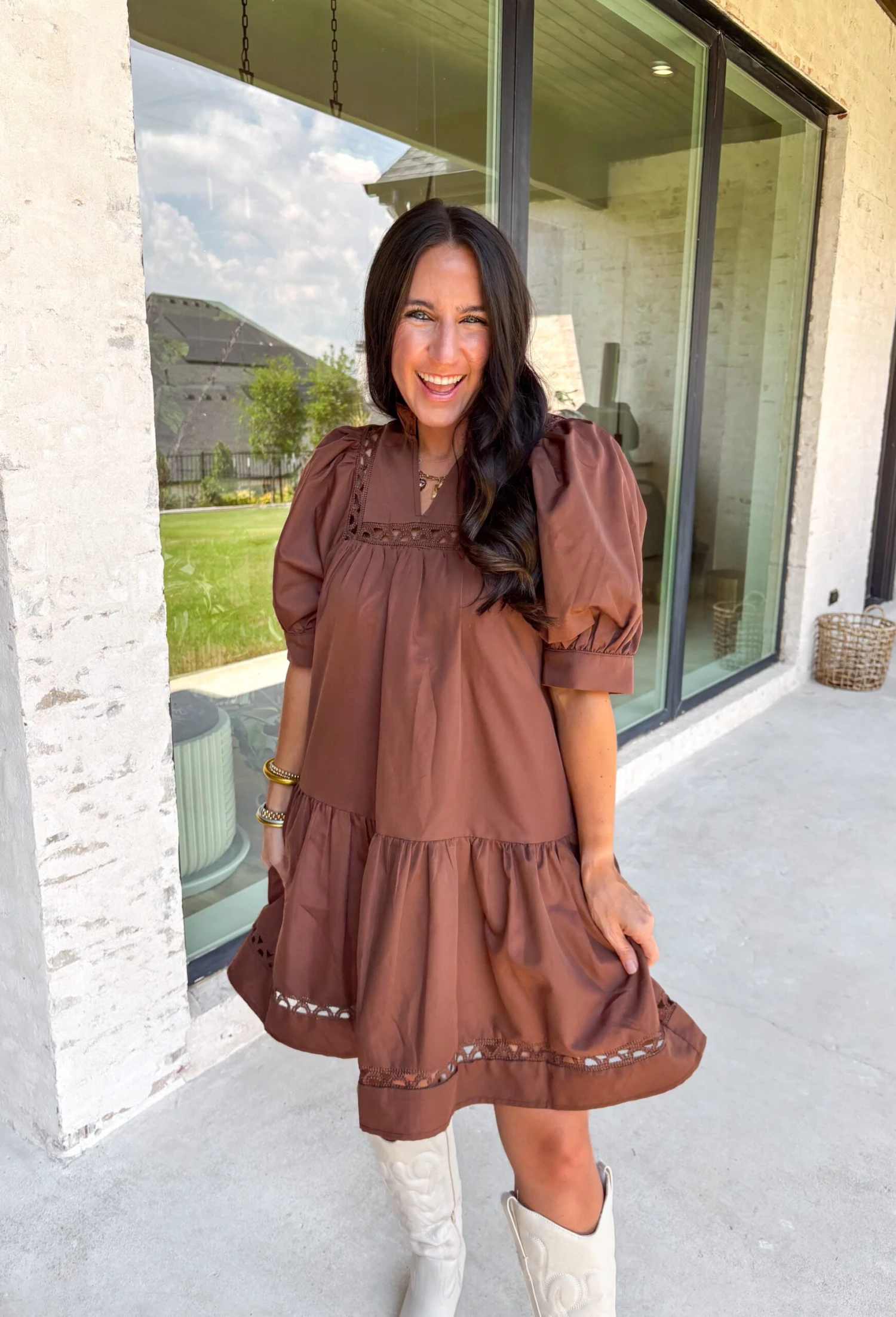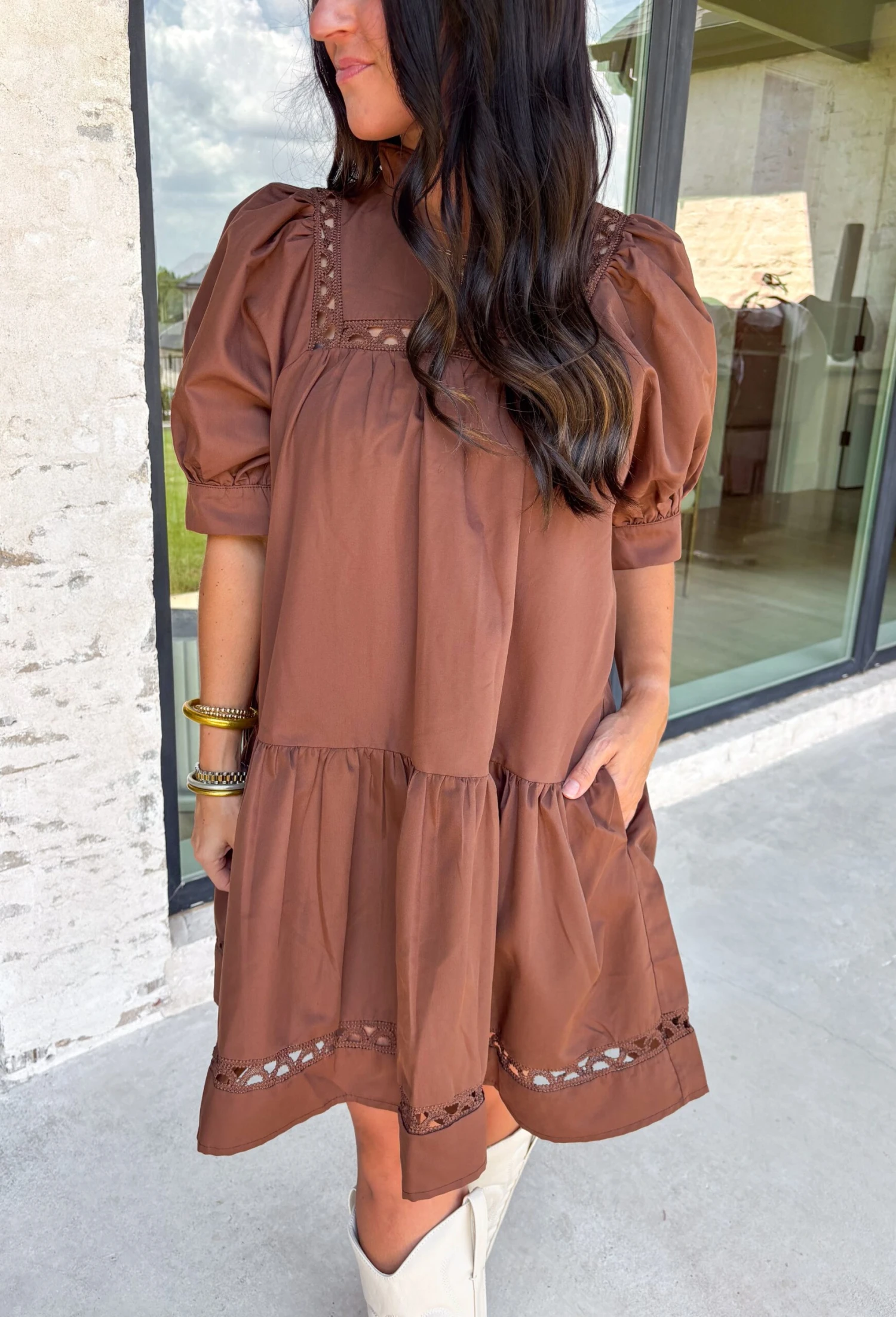 Add some autumn whimsy to your wardrobe with this brown dress that’s all about charming details. The scallop trim insets at the yoke and skirt bring a playful twist, while the ruffle hem and cuffed elbow-length sleeves keep things cozy and cute. With a flattering fit and handy side pockets, this lined dress is perfect for fall festivities.