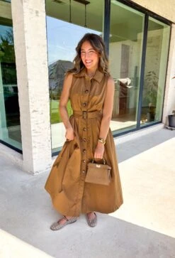 This brown pleated midi dress is the cozy-season staple your fall wardrobe’s been waiting for! With its timeless silhouette, accent button front, and removable self belt, you can cinch it up or keep it casual depending on your mood. Add in an elastic back waist and pockets (yes—pockets!), and you’ve got a comfy-meets-chic dress you’ll reach for all autumn long.