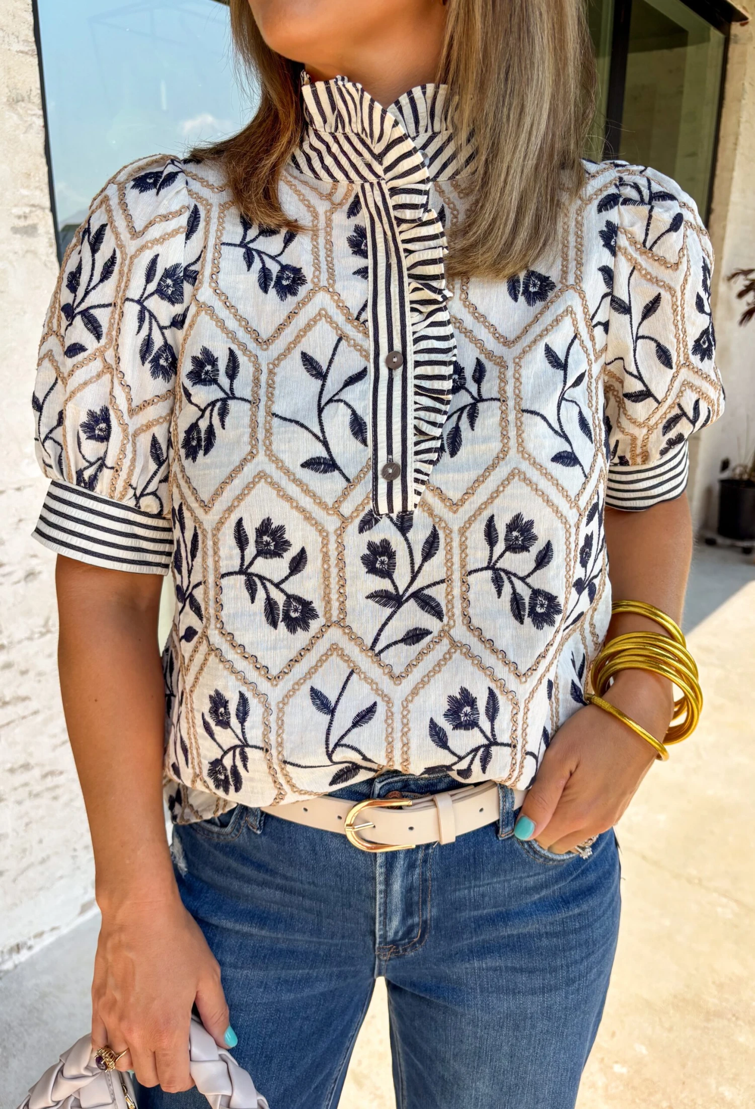 A timeless favorite with a moody fall twist! This neutral top features intricate dark floral embroidery that feels equal parts earthy and elegant. The striped contrast banded short sleeves and button front placket add a tailored touch, making this the perfect piece for everything from work to weekend apple-picking adventures.
