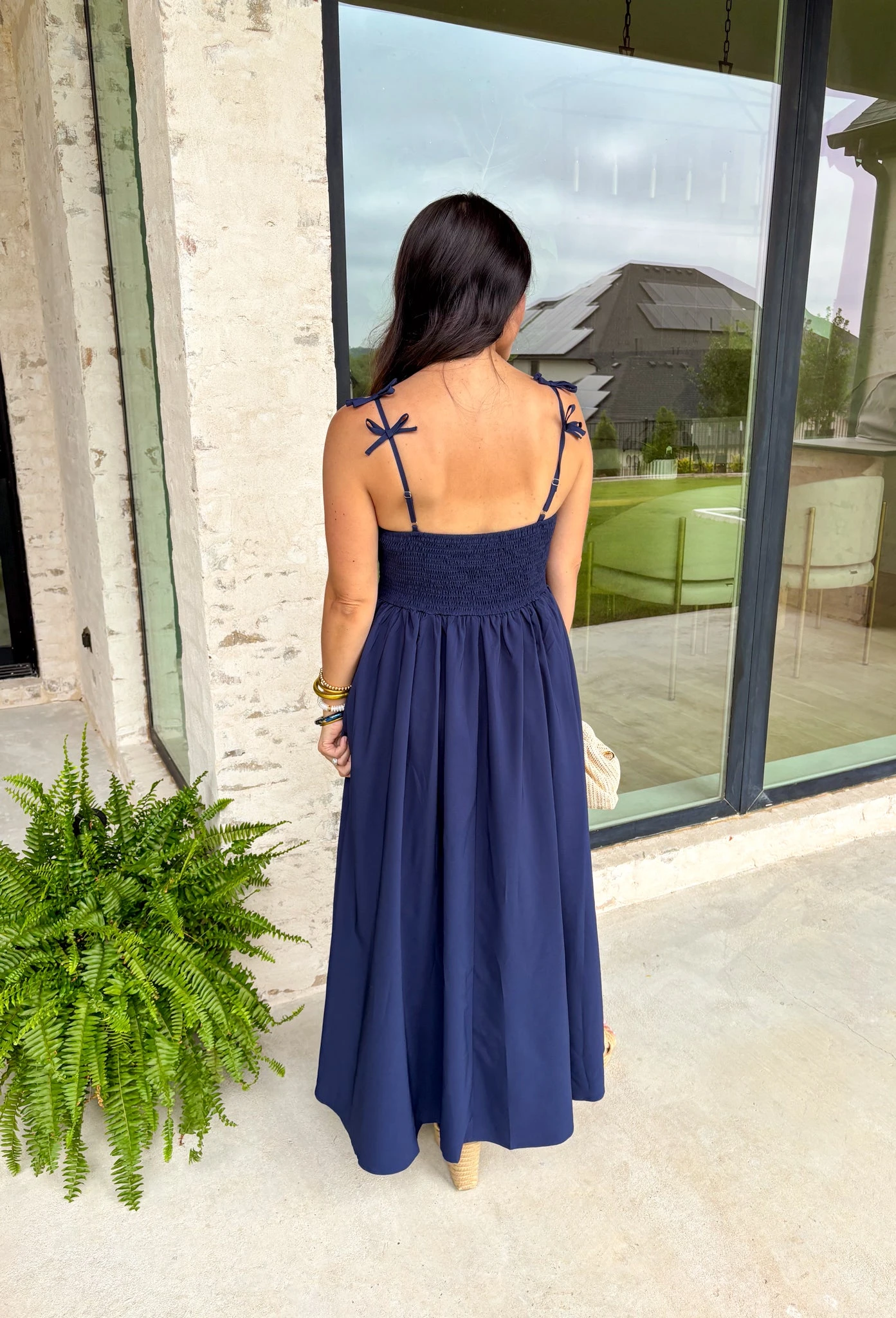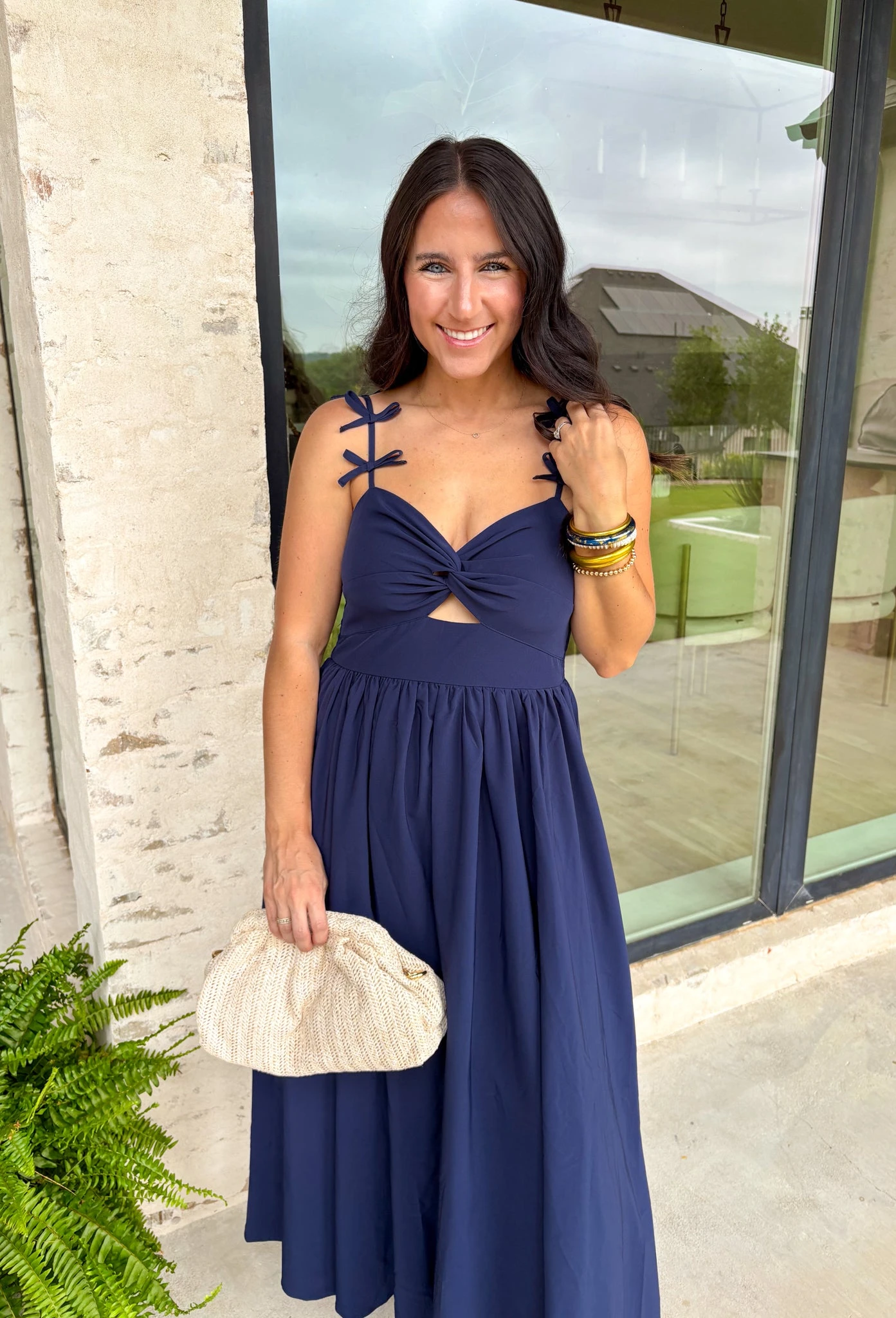 All tied up in style! This sleeveless navy midi dress is the kind of easy, flattering outfit you’ll want on repeat. The twist front top adds a touch of flair, while the bow-accented adjustable straps bring the charm. With a comfy smocked back and pull-on fit, it’s equal parts effortless and chic. Perfect for sunny weekends, dinners out, or vacay strolls!