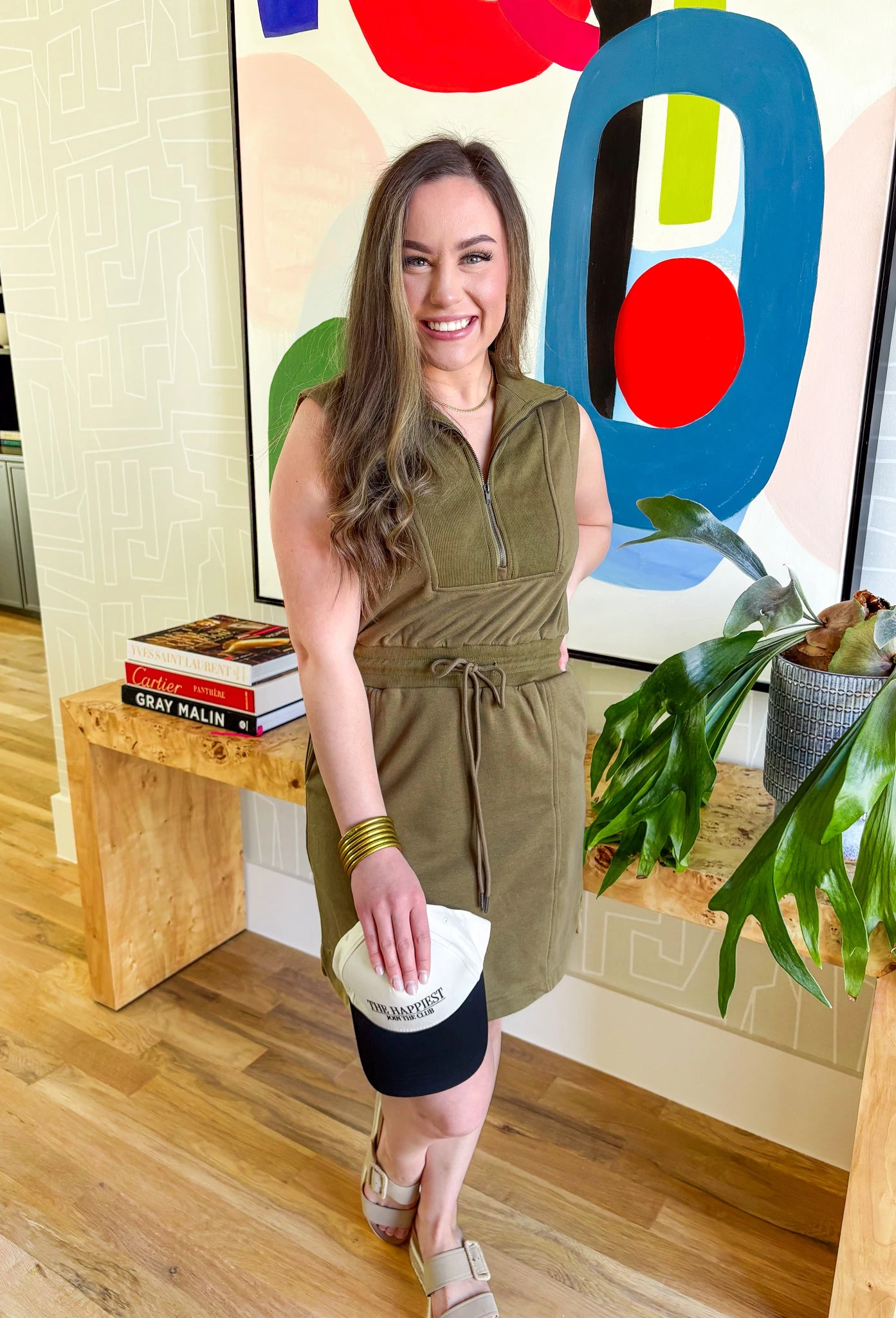 Effortlessly chic and feminine, our On The Run Dress in Olive is the perfect addition to your wardrobe. The olive color and sleeveless design exude confidence, while the zip-up detail and self-tie waist offer a flattering fit. With convenient pockets and a stylish split hem, it’s a must-have piece!