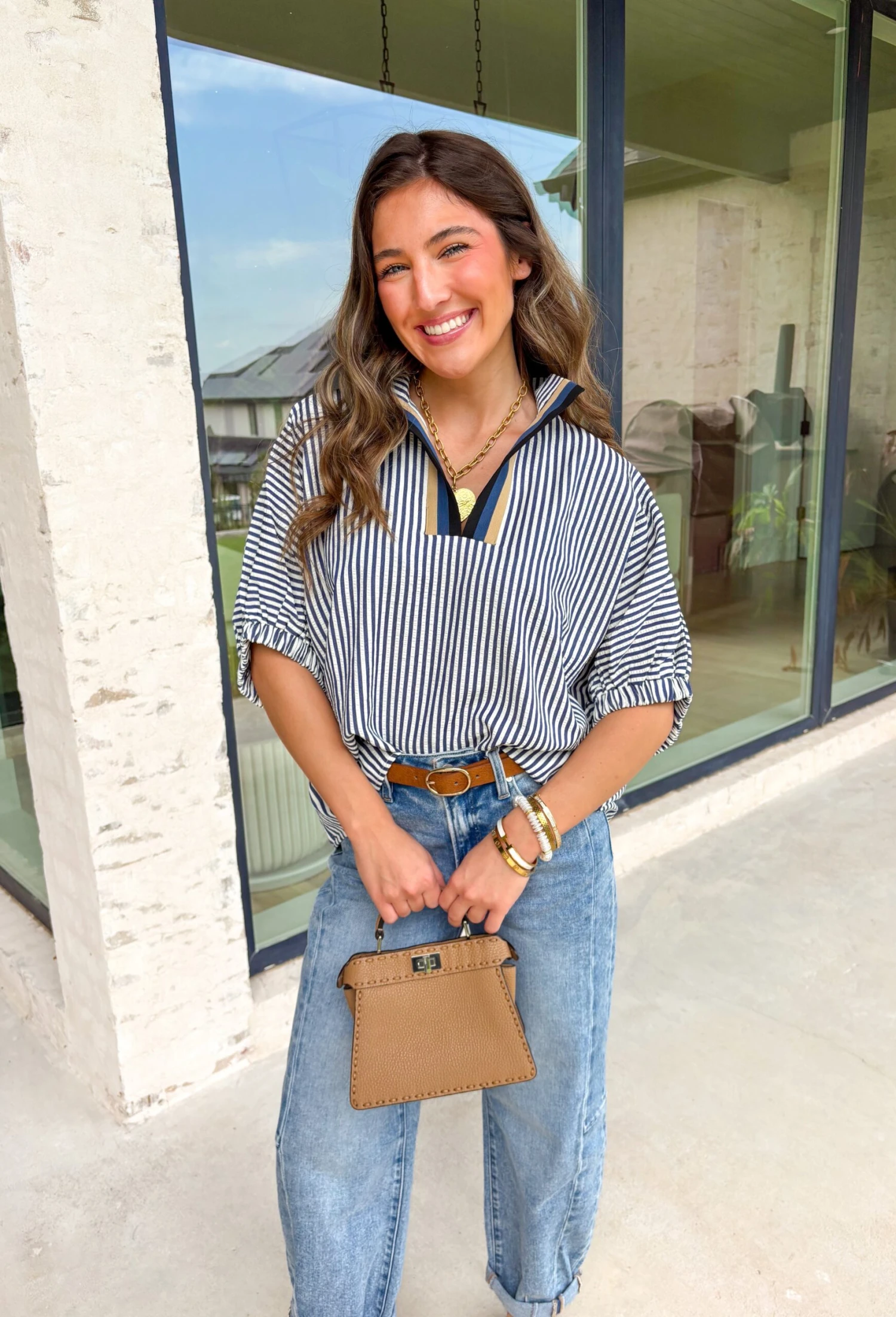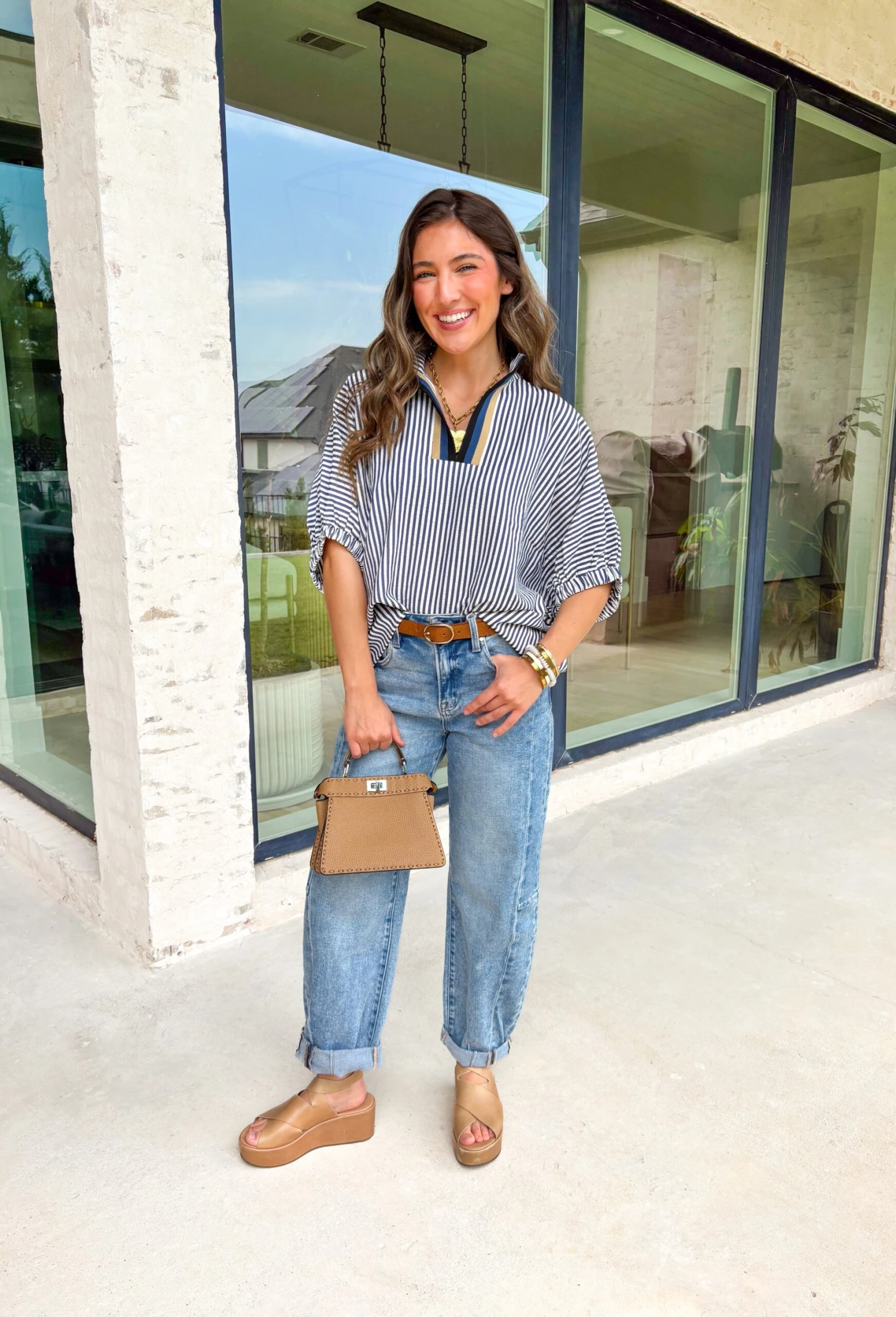 Add some pep to your everyday look with this playful stripe dolman top! The navy and off-white combo gives a cozy fall vibe, while the multicolor ribbed neckline adds just the right pop of color. It’s comfy, eye-catching, and ready for all your layered looks this season.