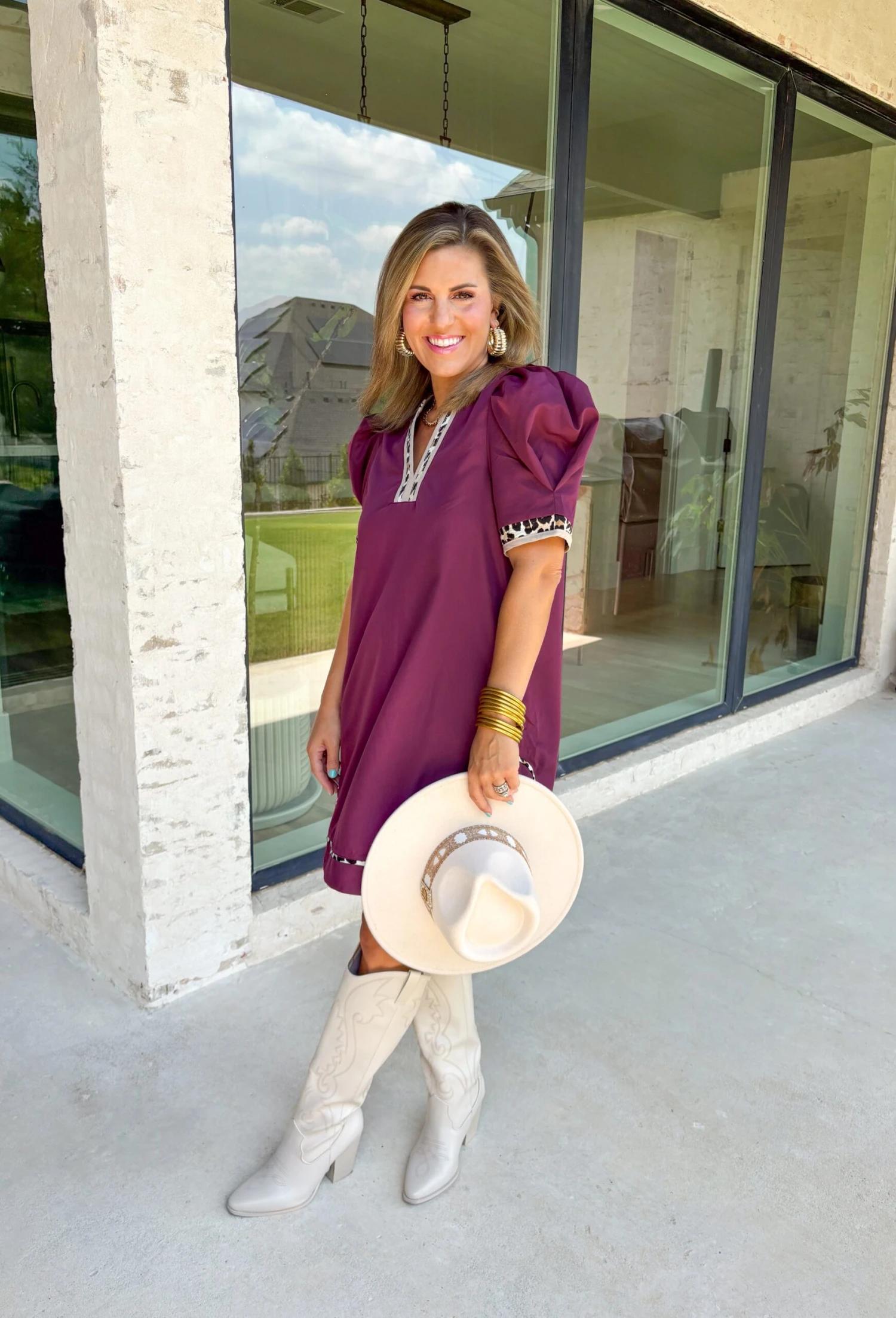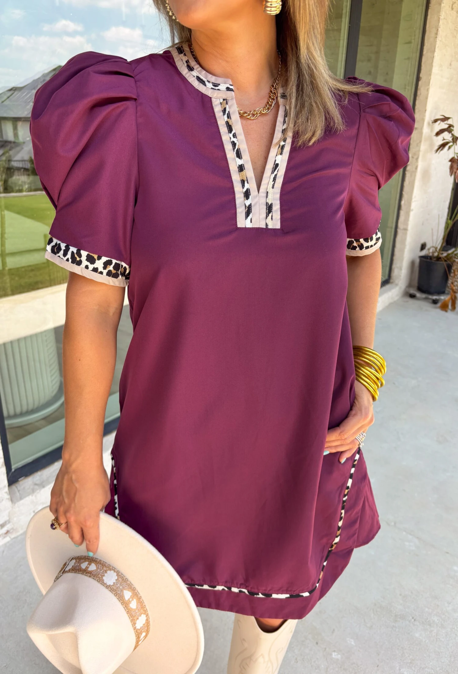 Bring on the bold with this playful plum dress! Featuring sweet pleated puff sleeves and a fierce leopard print contrast detail, it’s equal parts fun and flattering. The comfy fit, side pockets, and full lining make it a must-have for everything from fall outings to girls’ night out.