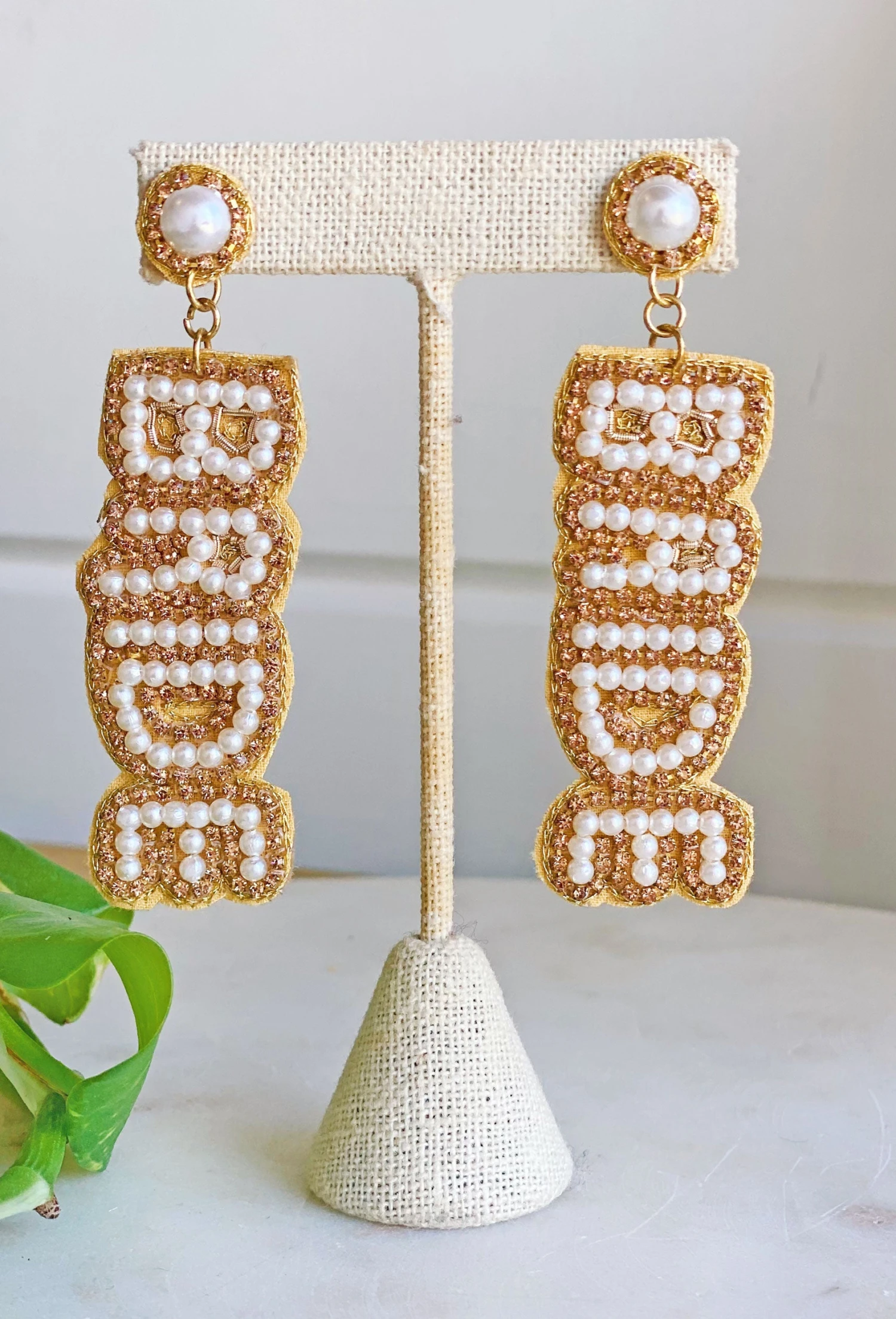 Looking for the perfect gift for a bride-to-be? These beautiful Pearl Bride Earrings are perfect for any bachelorette party or wedding day! The earrings feature “bride” written in pearls, with a gold sparkle outline. They make a great gift for any bride who wants to feel extra special on her big day!