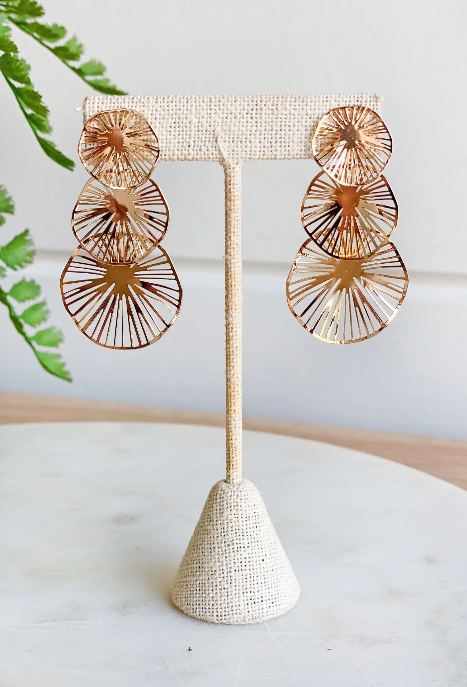 The Pretty Things Gold Earrings offer an abstract design that is sure to make a statement. Crafted from three tiered circles, these earrings feature a modern look that will have you standing out from the crowd. Make a unique fashion statement with these one-of-a-kind earrings.