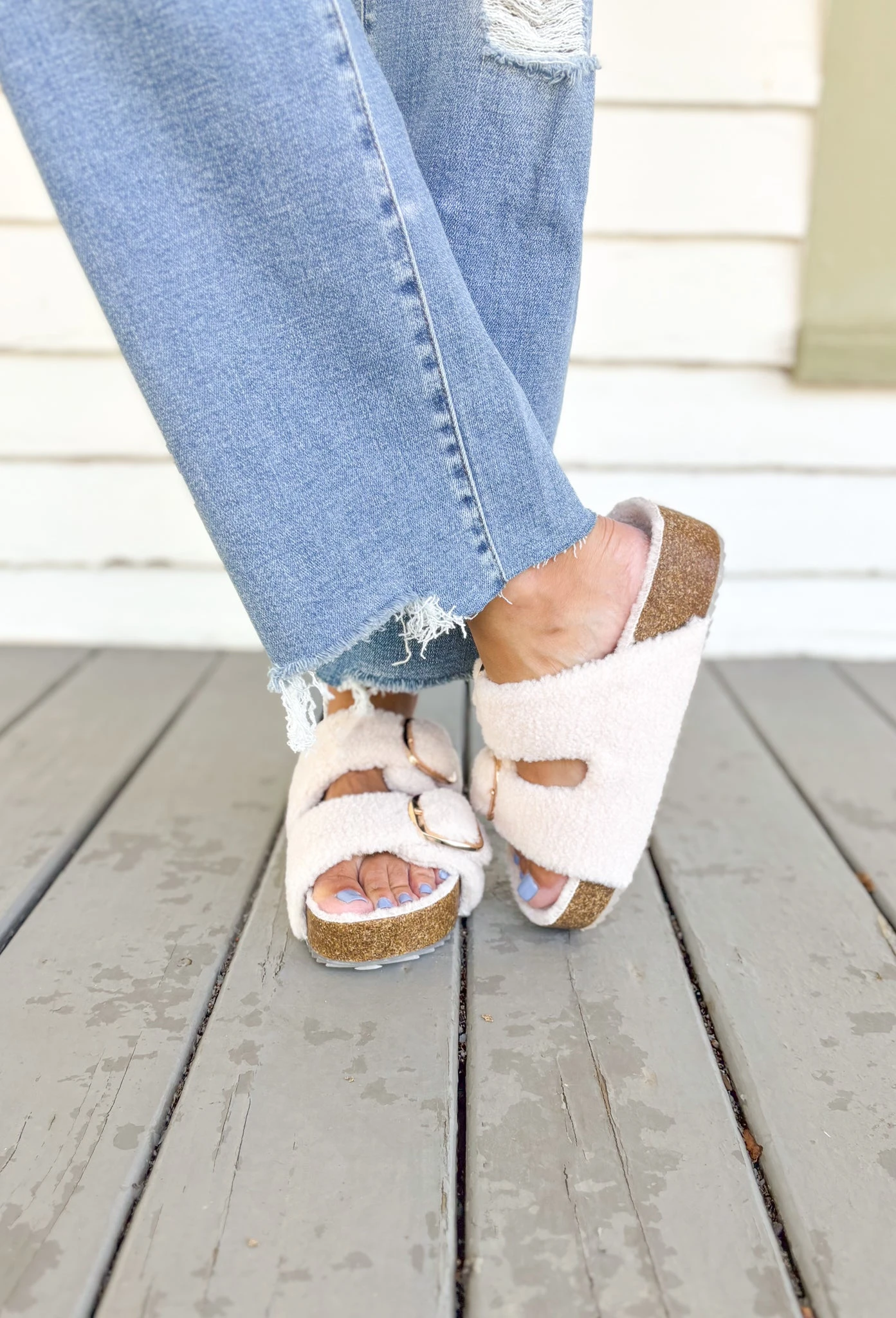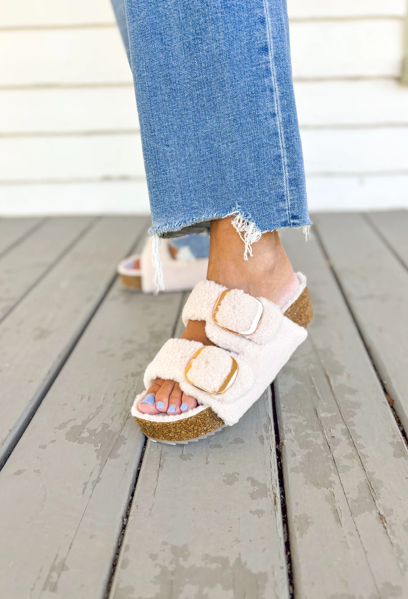 Embrace comfort and style with our Qianna Shearling Lined Sandals. Classic slide design meets cozy shearling lining, perfect for chilly days. The neutral color pairs well with any outfit, while the double buckle closure straps ensure a secure fit. Upgrade your sandal game and stay warm with Qianna.