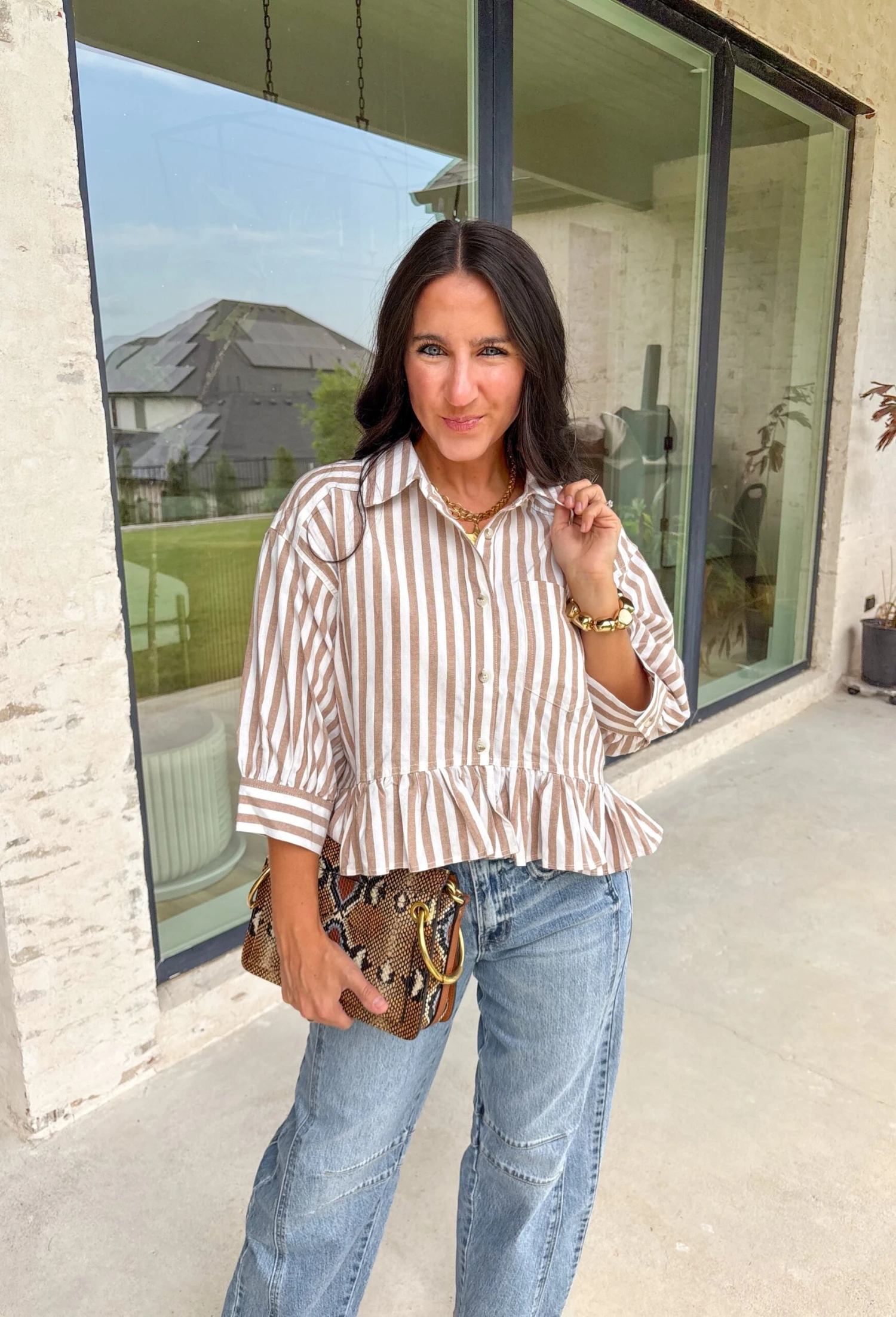 - Features: Mocha and off-white stripe pattern, ruffle hem, collared neckline, button-down front