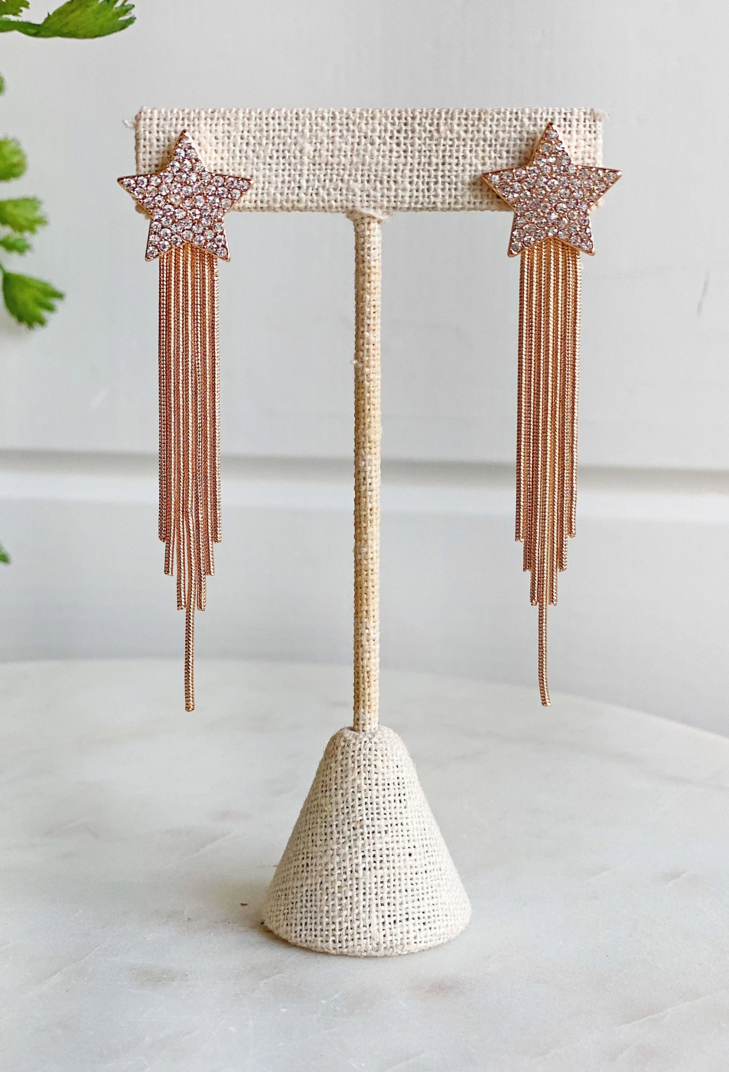 Show off your style with these stunning Shooting Star Earrings. These earrings feature pave crystal stars with a drop snake chain detail. These earrings are sure to turn heads!