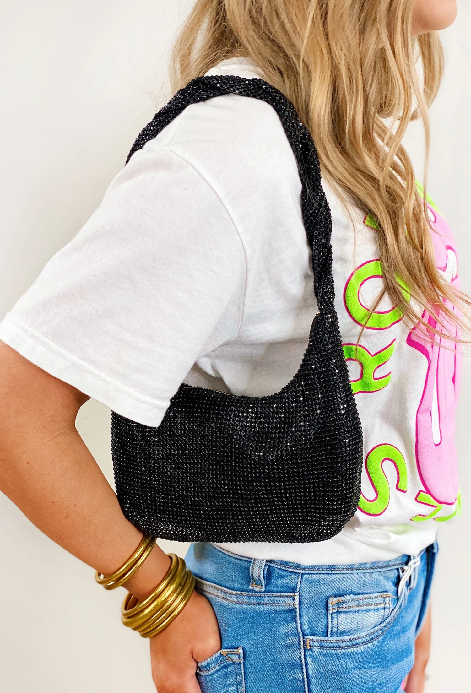 This black crystal-encrusted shoulder bag is the perfect accessory for a night out, or any special occasion. The glitzy look will add excitement to your ensemble and is sure to make a statement!