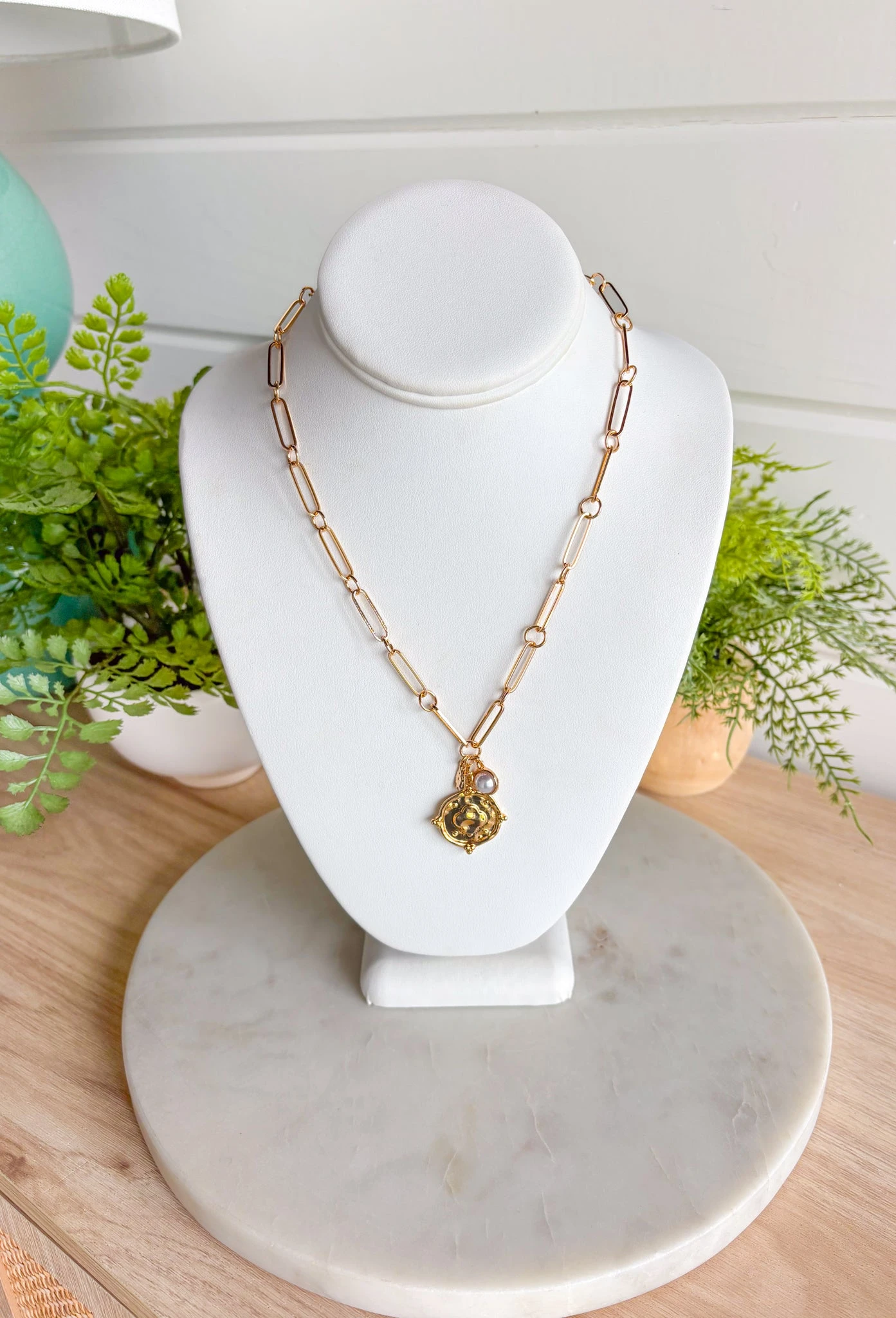 Add a little luxe to your layers with this gold paperclip chain necklace featuring a charming gold pendant and dainty pearl detail. It’s effortlessly chic and pairs well with everything—from your favorite tees to elevated evening looks.