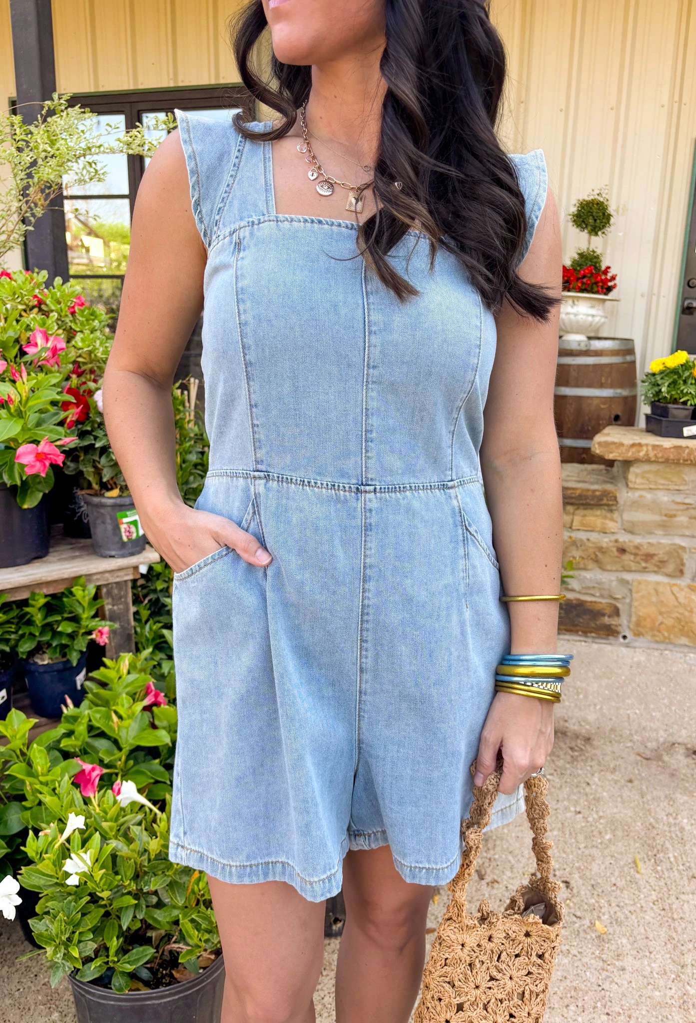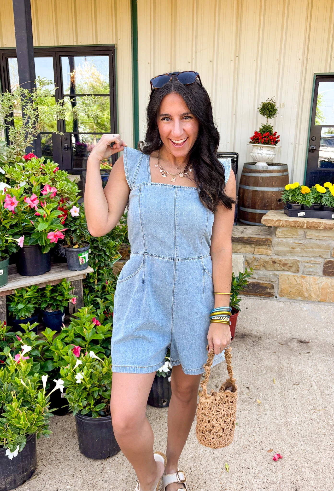 Get ready to own summer and sunny outings in this sleeveless light wash denim romper from Wishlist. Featuring smocked detailing and a chic tie closure in the back, this romper is equal parts comfy and stylish. The elastic waist ensures the perfect fit, while front pockets add a practical touch. Made from 100% cotton, it’s breathable and perfect for those sunny days. Pair it with sneakers for a casual vibe or dress it up with wedges and bold jewelry. This versatile romper is calling your name—don’t wait to add it to your lineup!