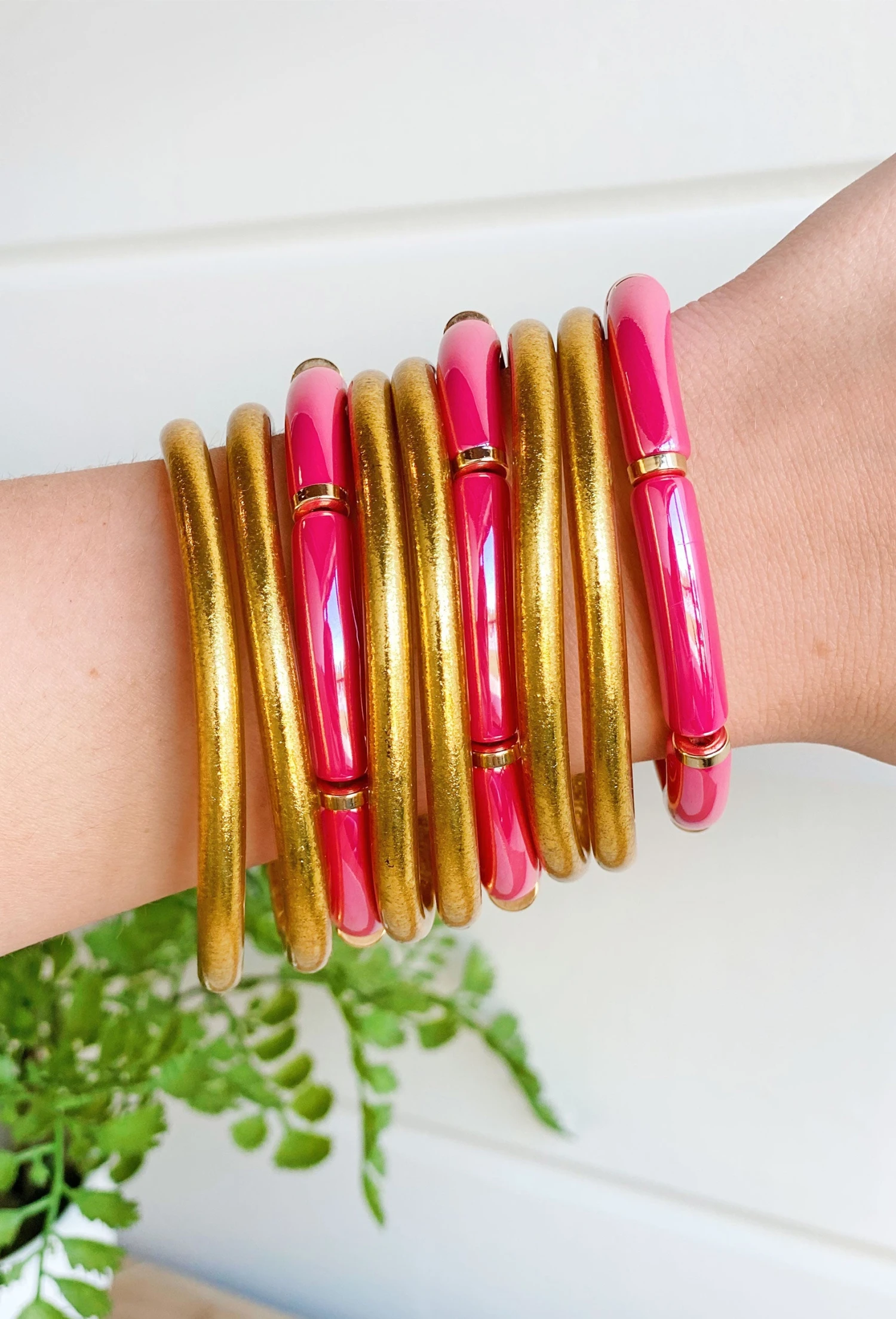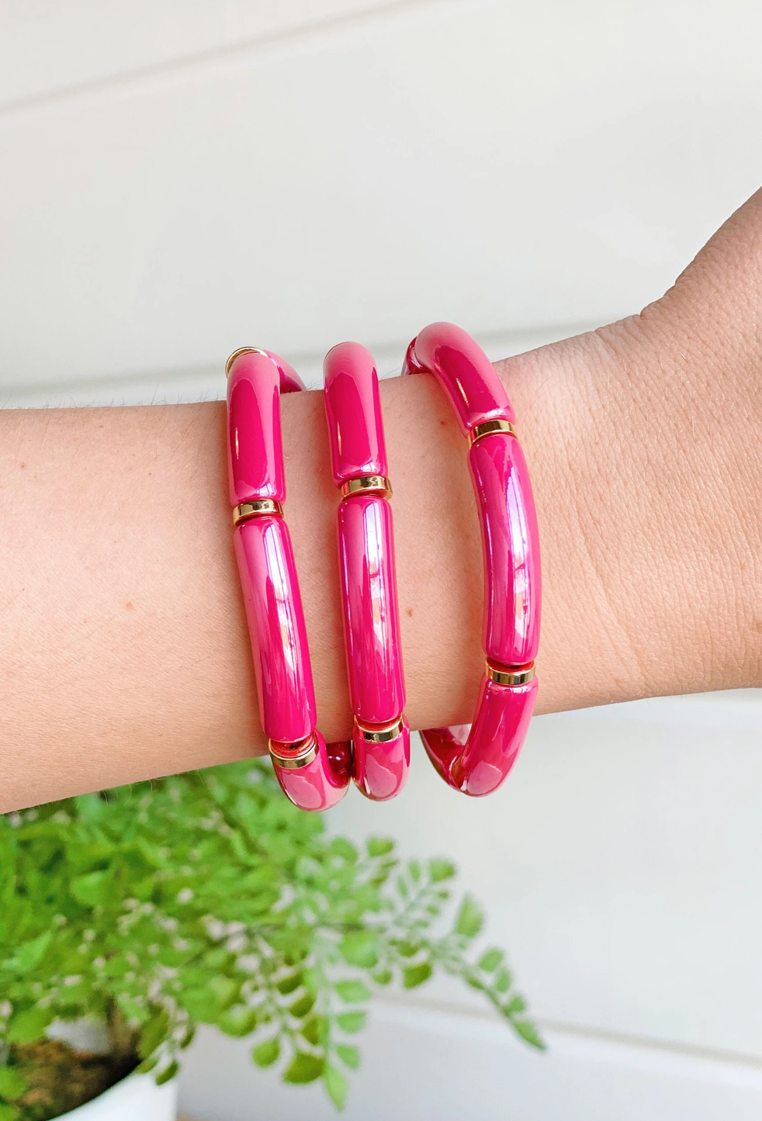 Look beautiful in the Summer Feelings Bracelet Set in Fuchsia. This set of three bracelets is made with a combination of acrylic beads and gold beaded details for a contemporary look. Elevate any summer look with this stylish set.