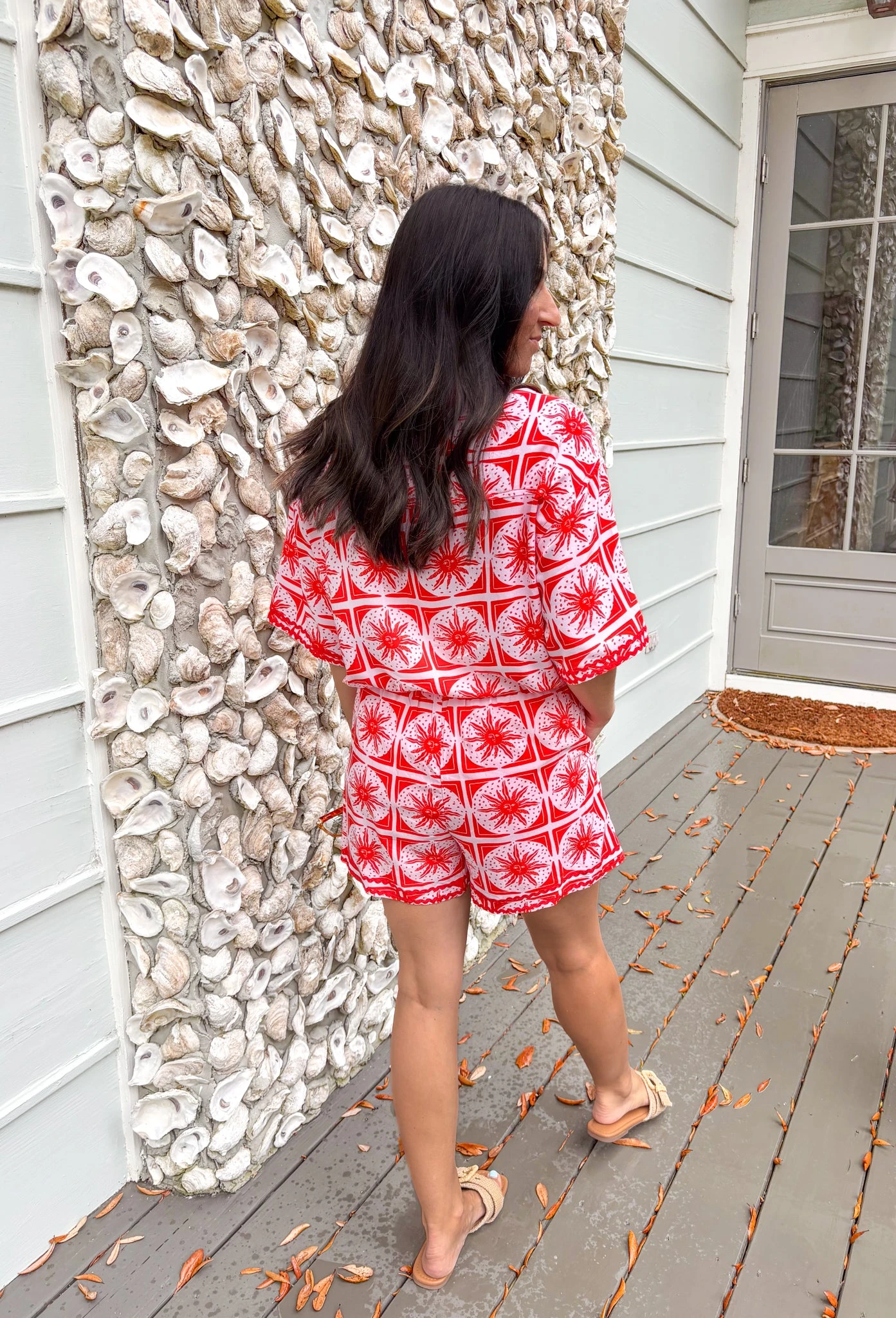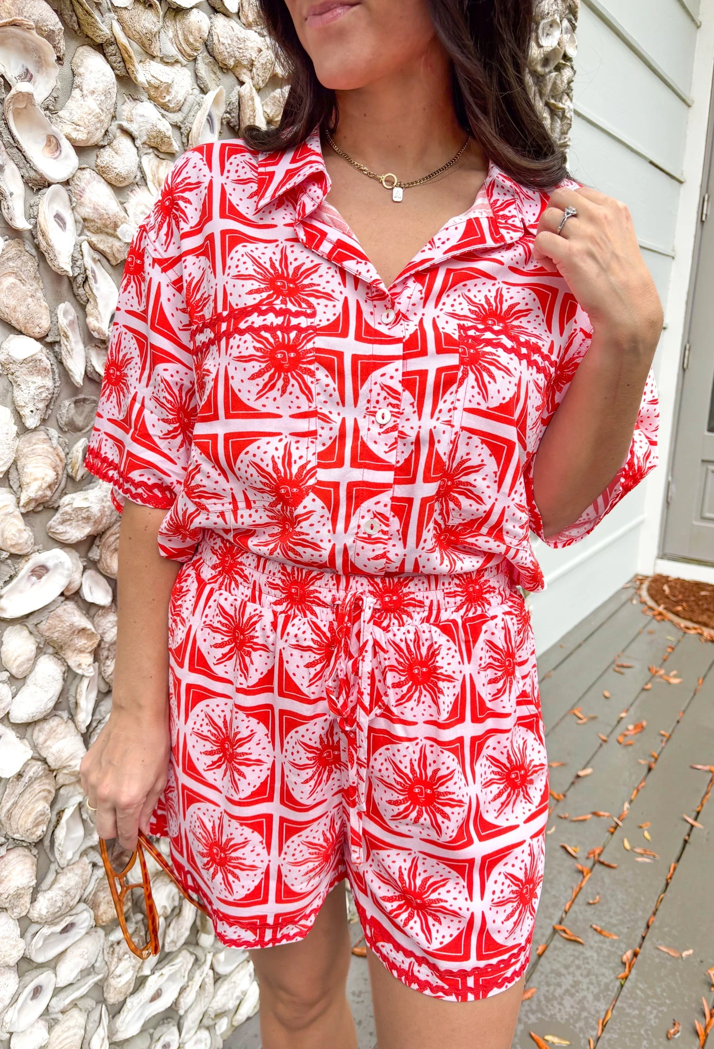Bring the sunshine wherever you go with this dreamy two-piece set! Featuring a light pink button-down top with a bold red abstract sun print, this set is full of happy vibes. The collared neckline and front pockets add a structured touch to the relaxed fit, while the matching elastic waist shorts keep things comfy and cute. Made by New In from breathable rayon, it’s perfect for vacation days, lounging at home, or grabbing brunch with your girls.