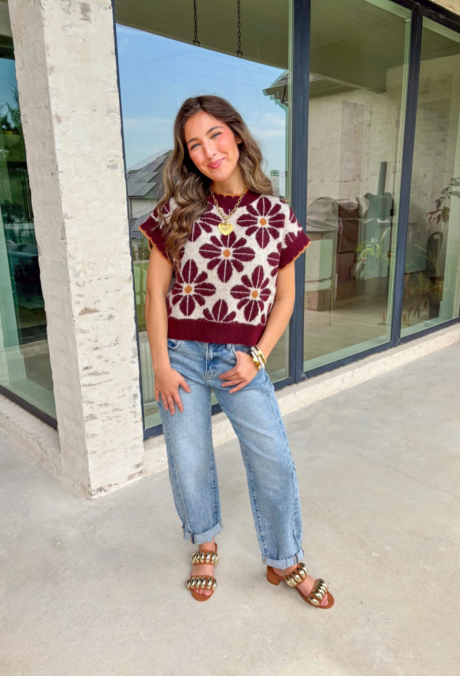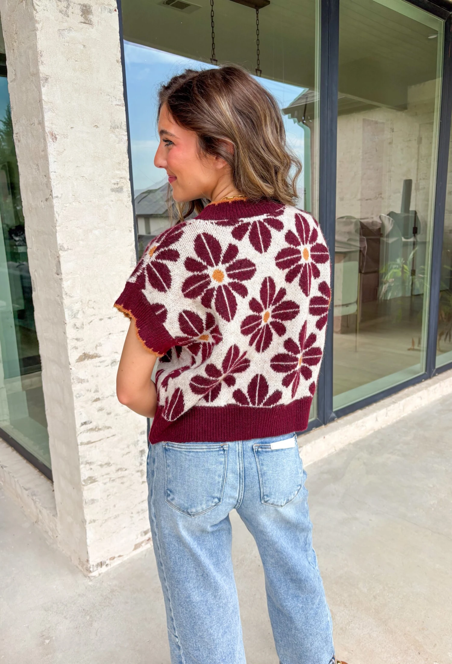 Cozy up in style with this abstract floral sweater—your go-to layer for crisp fall days and pumpkin-spiced everything. With a rich burgundy floral design set against a soft neutral background, this short sleeve sweater is accented with warm rust trim for that just-right autumn touch. Pair it with denim or a corduroy skirt for a look that’s effortlessly charming and cozy.