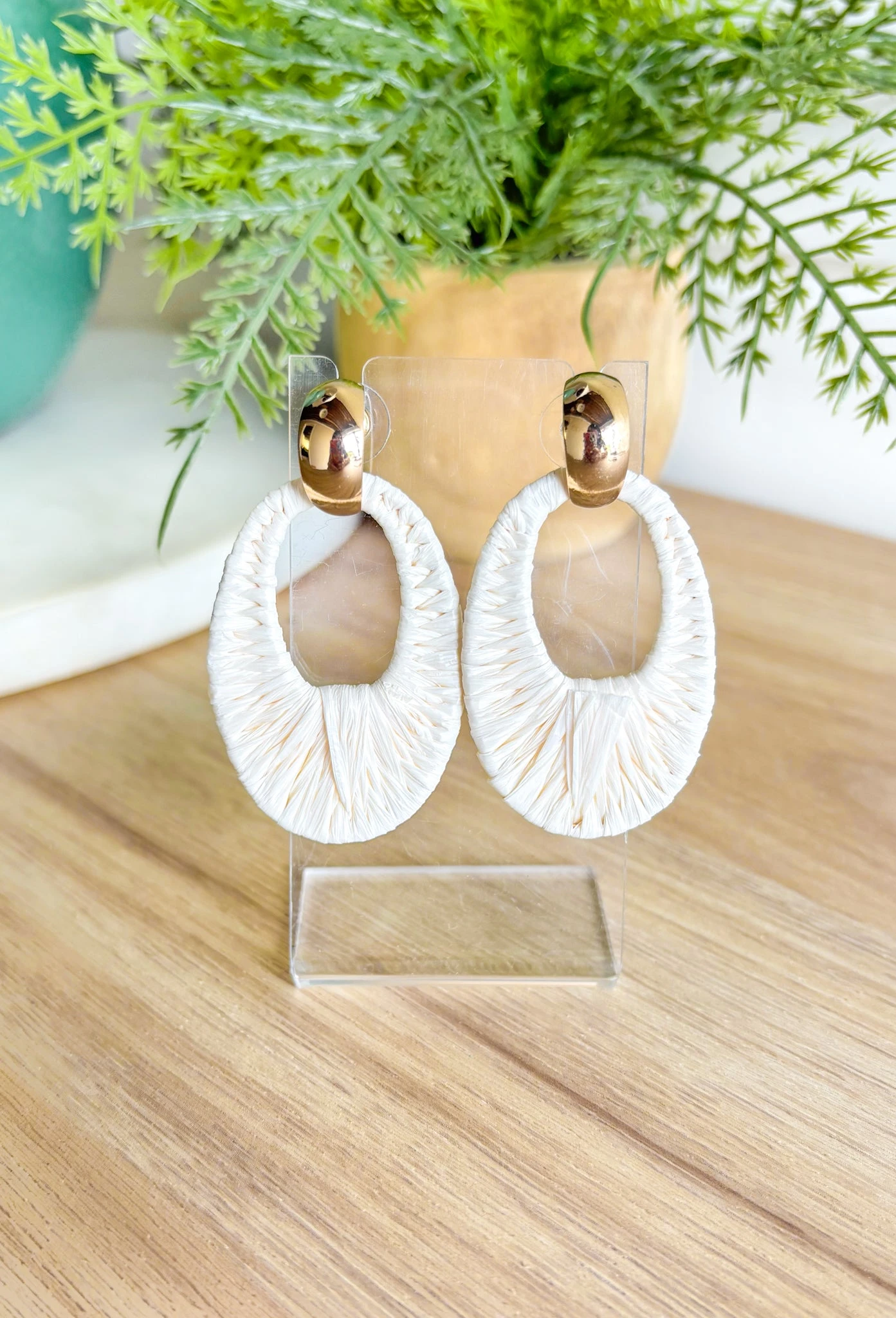 Make a statement in these summer-ready Take A Chance Earrings in Ivory . Featuring ivory raffia wrapping with a pop of gold, this accessory is sure to take any outfit up a notch. Lightweight and easy to wear, these earrings are the perfect completing touch to your warm weather wardrobe.