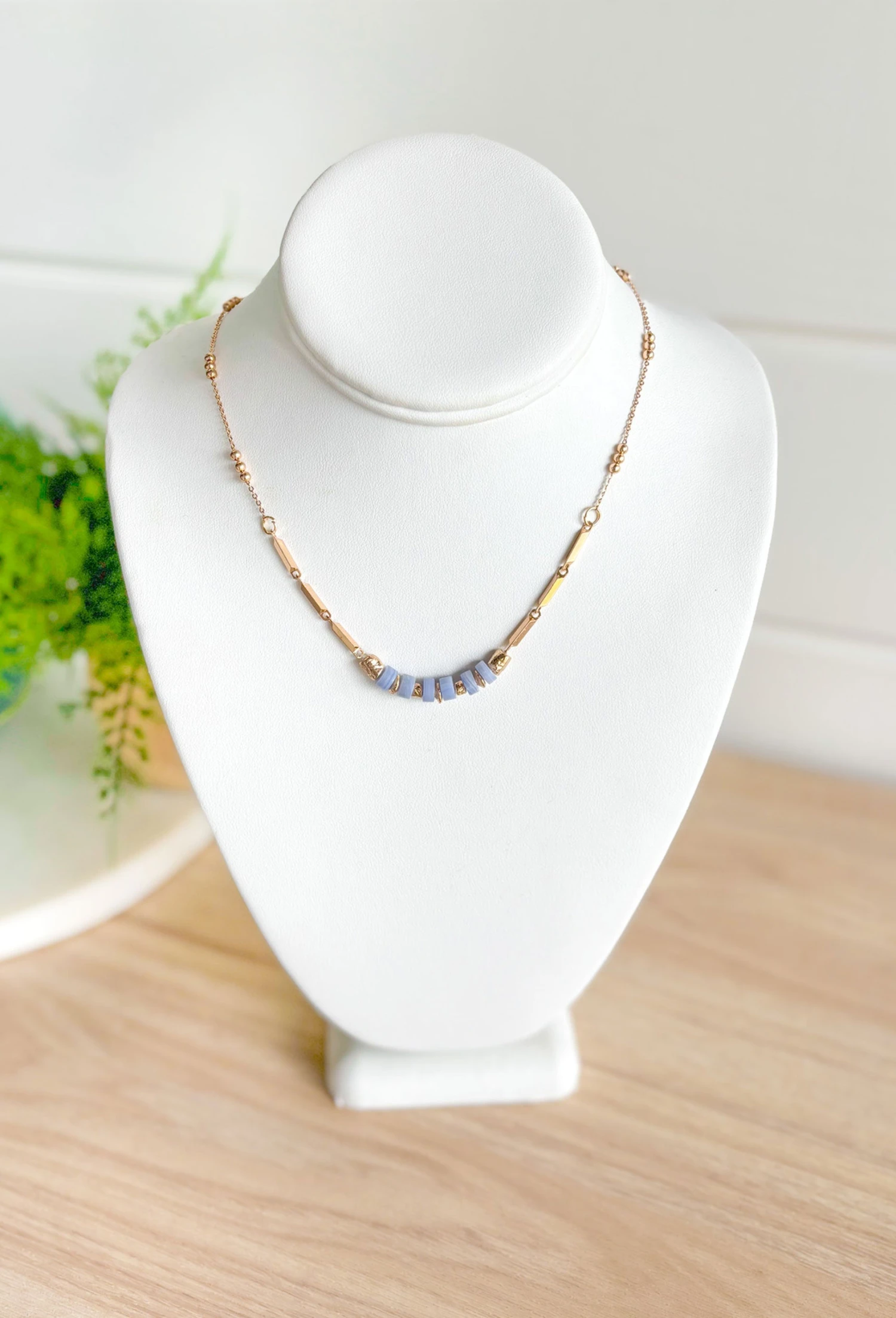 Enhance your outfit with our Take Some Time Necklace in Blue. This dainty gold chain necklace features a pop of light blue beaded detail, adding an effortlessly chic touch to your look. Make a stylish statement with this versatile piece.