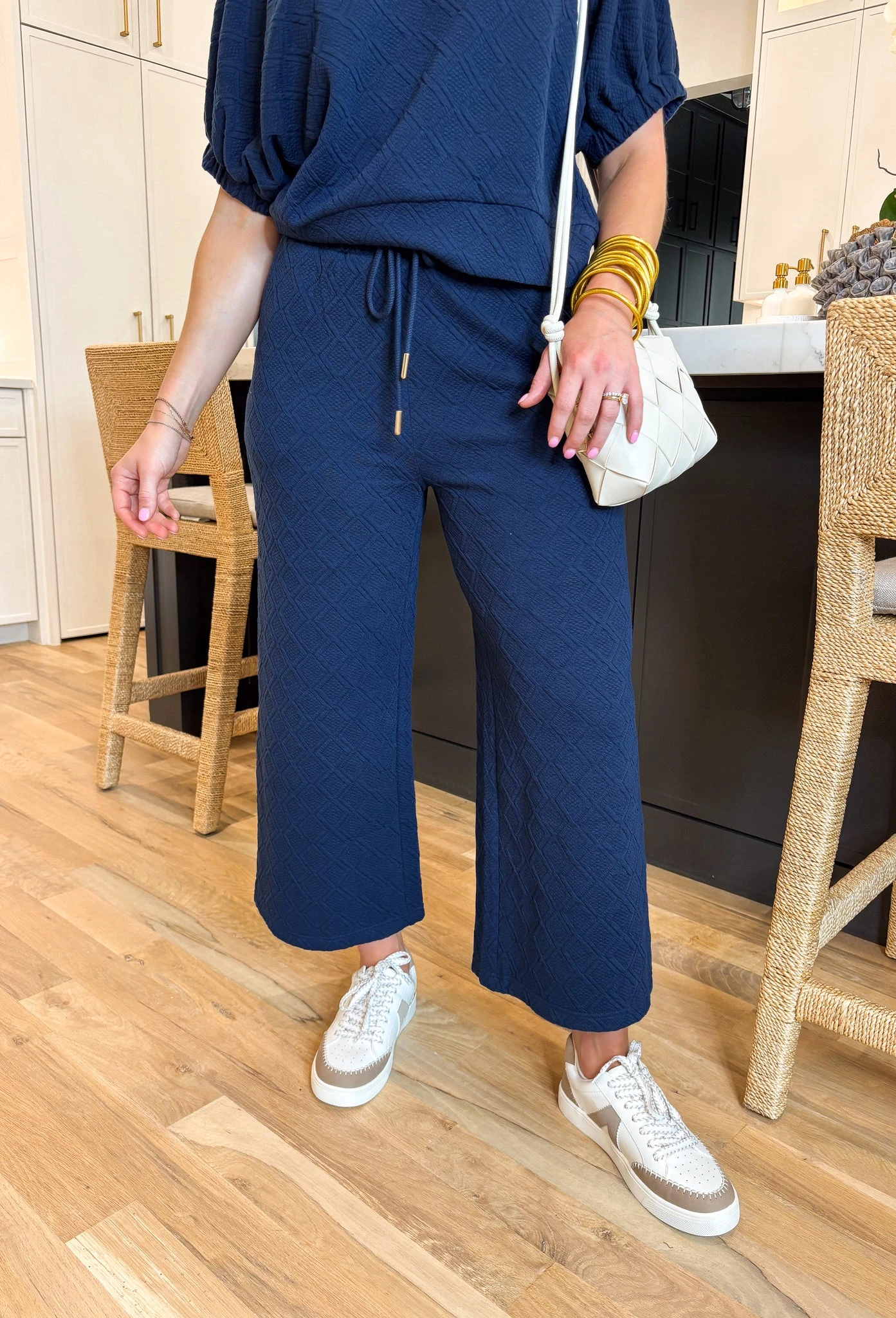 Stay comfortable and stylish with these navy embossed high-waist pull-on pants. Designed with an adjustable drawstring and an elasticated waistband, they offer a perfect blend of practicality and modern flair. The ankle-length cut makes them versatile for casual outings or dressed-up occasions. Crafted by Entro with a soft polyester-spandex blend, these pants deliver stretch and comfort all day long.
